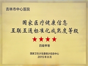 2015年8月6日,2015中国卫生信息技术交流大会在苏州召开。吉林市中心医院副院长王建东代表医院受邀参加并在会上接受了国家卫生计生委授牌。本测评等级共分为五级,因五级还没有测评细则,目前全国医院所通过的最高等级为四级,达到四级甲等标准的医院全国仅有5家。 -
