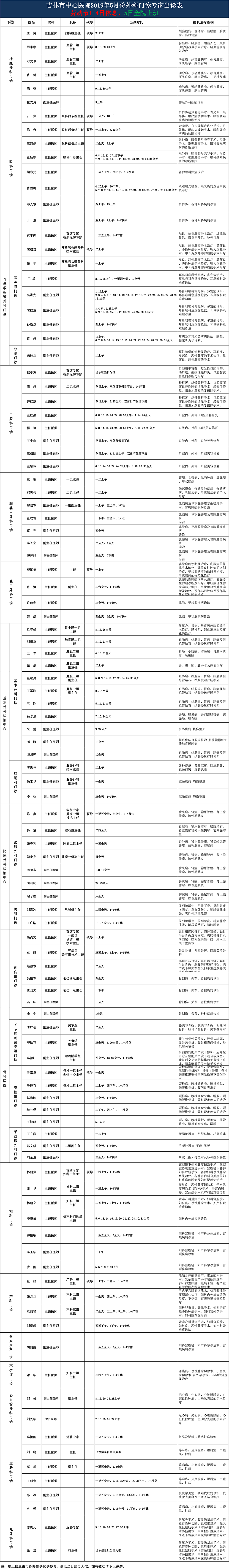吉林市中心医院2019年5月外科门诊专家出诊表