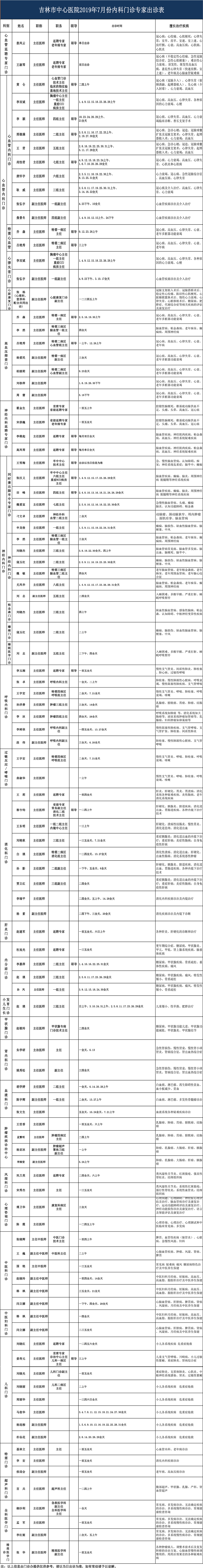 吉林市中心医院2019年7月内科门诊专家出诊表