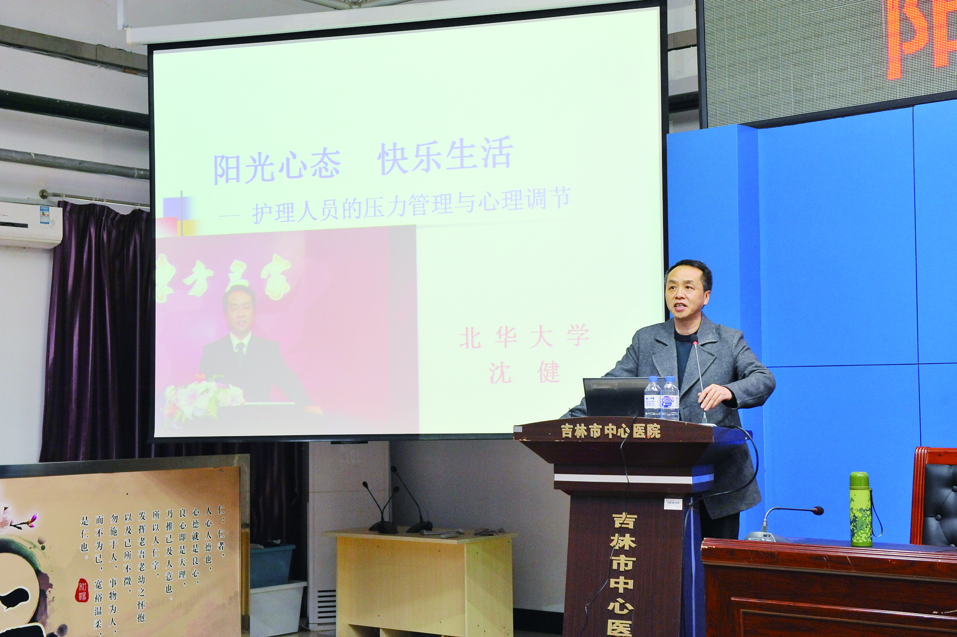 图① 北华大学心理学专家沈健教授为全院护理人员进行了一场精彩生动的“护理人员的压力管理与心理调节”健康心理知识讲座,全院各护理单元和康乃馨服务单元的300余名护理人员参加了此次讲座。