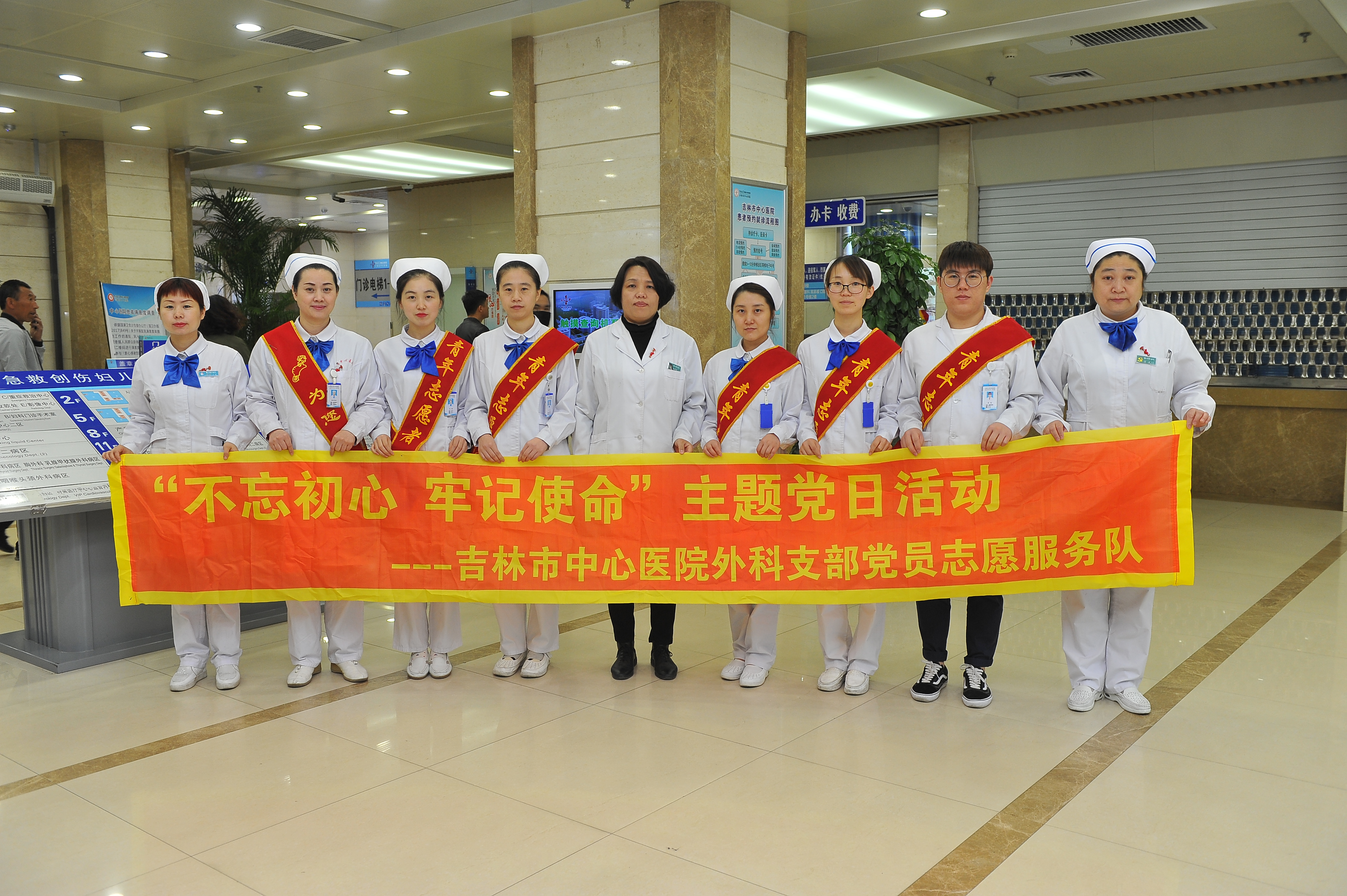 为纪念五四青年节,弘扬五四精神,展现团员青年风采,2018年5月4日上午,在医院团委的大力支持下,外一党支部组织团员在我院门诊开展了导诊志愿服务主题党日活动。 外一党支部书记冯雪梅、青年委员周晶共同出席活动,并与团员青年一起为病人进行导诊志愿服务。活动前,党支部书记冯雪梅进行了动员,她鼓励团员青年奋发图强,积极向上。要以导诊志愿服务活动为载体,牢记全心全意为病人服务的宗旨,不忘初心,牢记使命,为医院建设和发展贡献青春和力量。