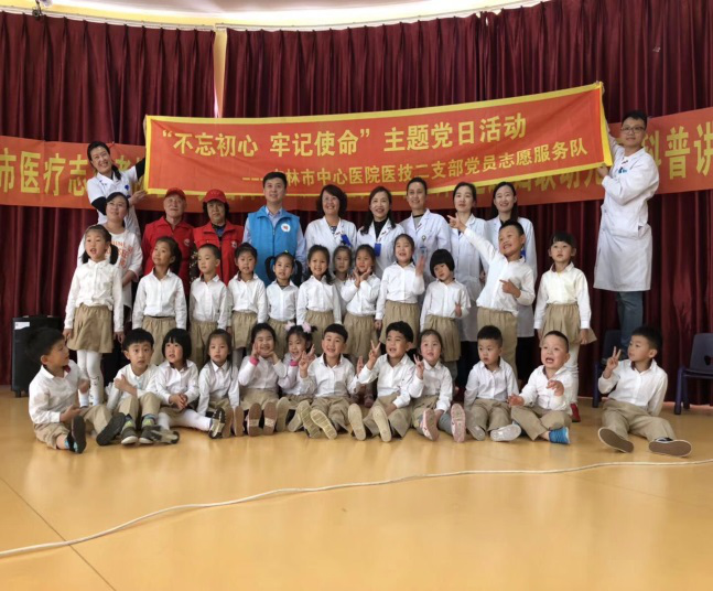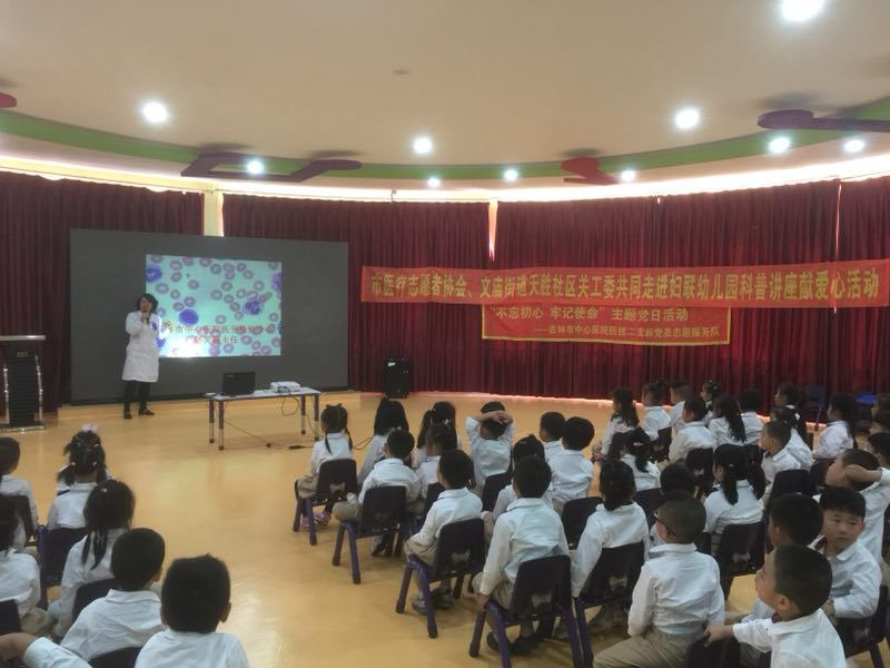 2018年5月24日,医技二支部党员志愿者服务队携手市医疗志愿者协会、文庙街道天胜社区关工委共同走进妇联幼儿园,对幼儿园中、大班的80余名孩子们,开展了科普讲座献爱心活动。