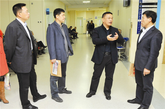 中心医院副院长岳东民(右二)与医院特邀社会监督员市政府办公厅机关党委书记郭东方(左一)、市纪委纠风室主任孙蕴琛(左二)、市工商局副局长李洪和(右一)到医院服务窗口现场督导检查医院行风工作