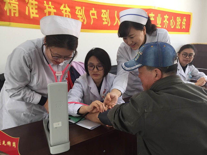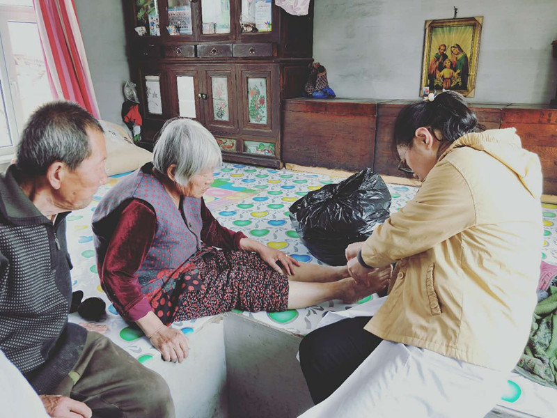 义诊小队的神经内科医生冯星彤、特需呼吸科医生蔡雨歧、骨科五病区护士长丛伟、特需二病区护士刘丹共为30余名村民进行了义诊咨询。听说包保户郭发和他的妻子行动不便,家离义诊点又远,不能来检查,神经内科医生冯星彤主动到家中为他们进行义诊。
