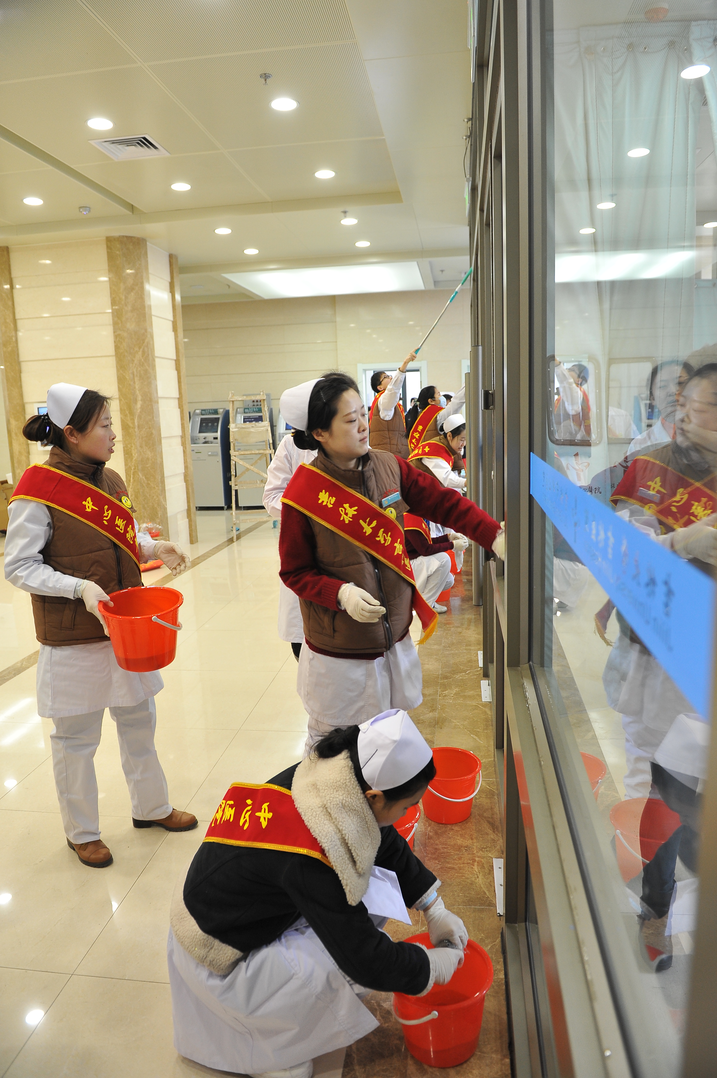 随着急救创伤妇儿楼的投入使用,来院就诊患者日益增多,为了给患者和医务人员创造一个干净、整洁的环境,3月5日,12名青年志愿者组成健康环保卫士志愿队,将急救创伤妇儿楼门前玻璃门和肿瘤外科门诊楼的旋转门擦洗得干净明亮。为使医院早日成为无烟医院,青年志愿者还佩戴着“禁烟监督员”的绶带,积极向患者和家属宣传吸烟的危害,劝阻其在禁烟场所吸烟。