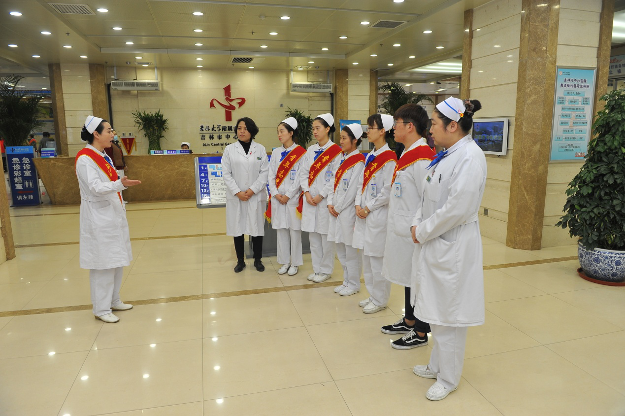 早上8点钟,外一团支部书记第二重症护士宋成刚刚值完后夜夜班,带领其他4名团小组长准时在1号楼门诊大厅导诊台集合。创伤1楼服务单元的张伟红护士长为志愿者们进行了重点培训,指导大家导分诊工作流程。