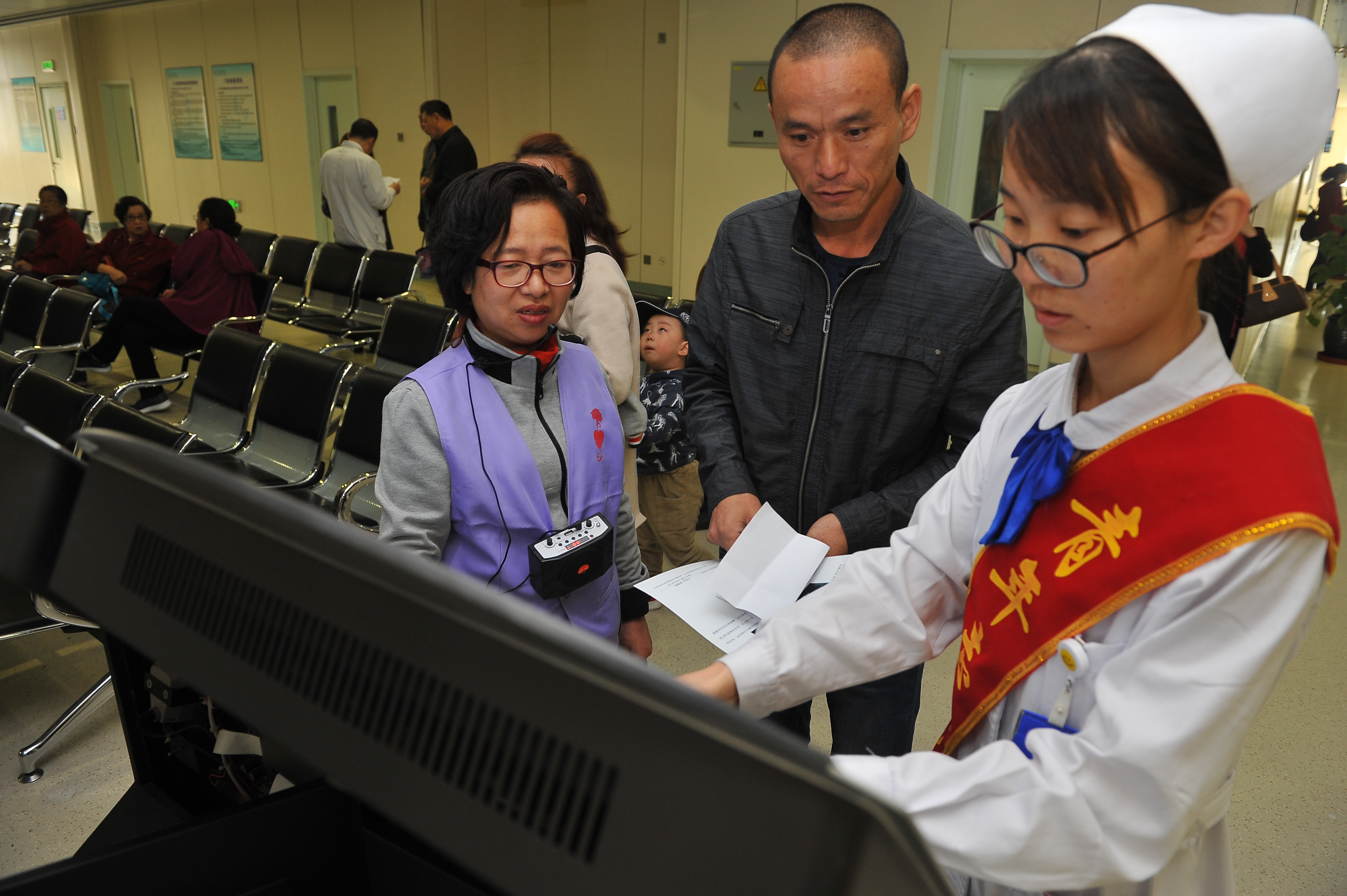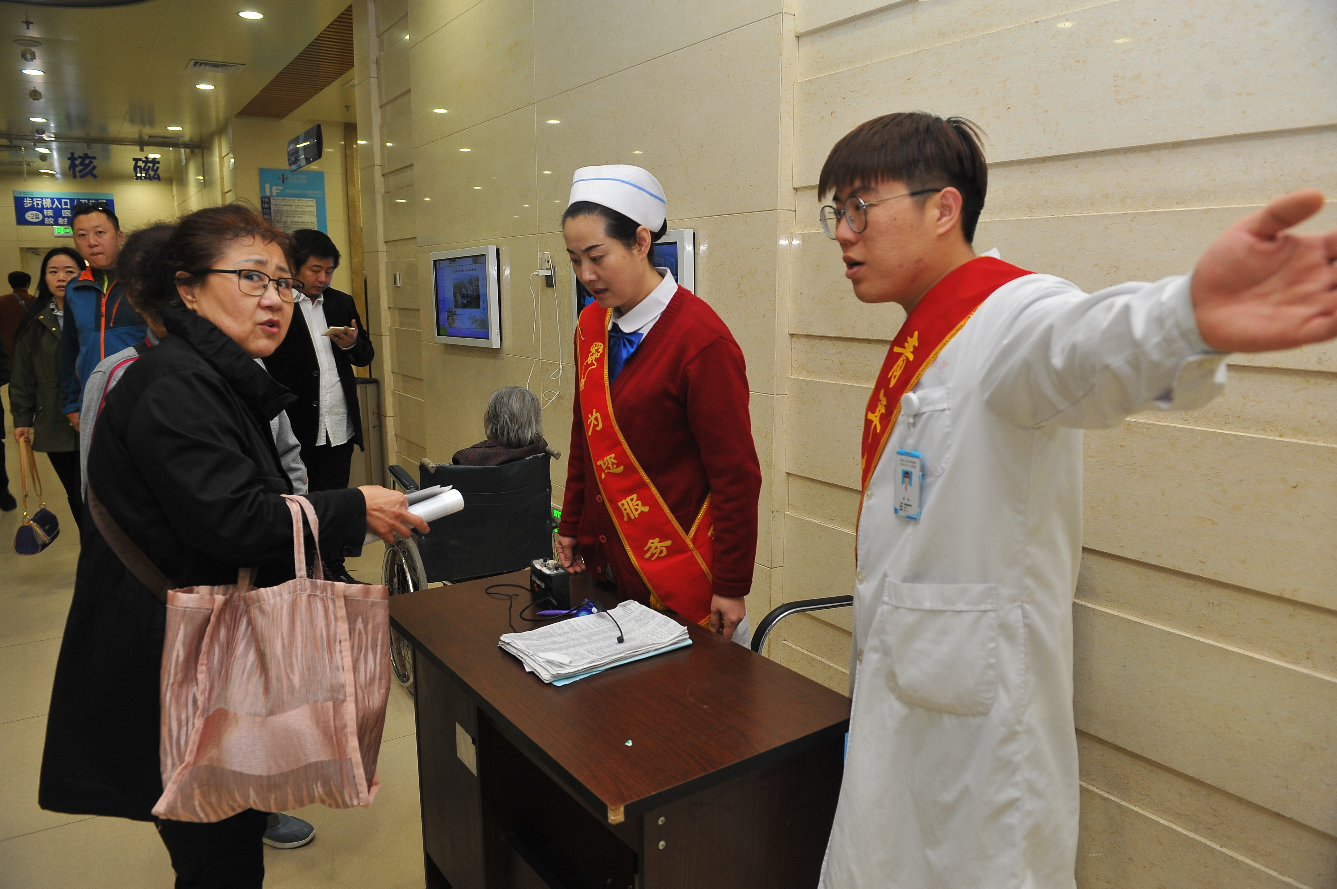 外一团支部书记宋成为刚刚办理完住院手续的患者及家属指引道路。
