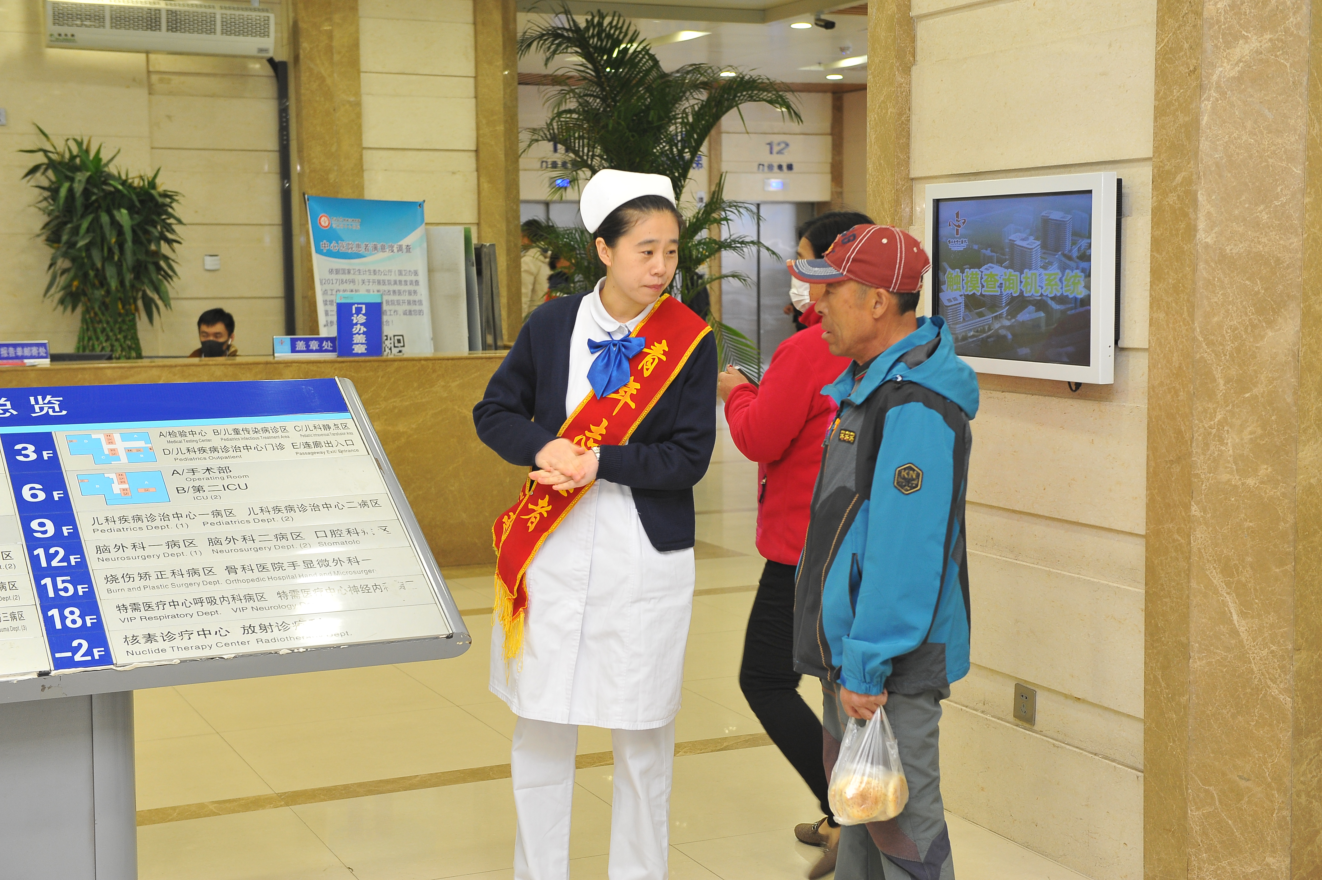 骨科二病区护士王露和骨科三病区科护士潘影在1号楼门诊大厅楼宇分布牌前为就诊患者导分诊