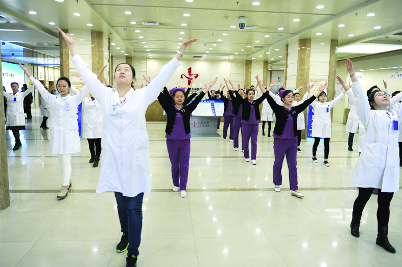 4月13日中午,中心医院急救创伤妇儿楼一楼大厅整齐地站着一群人,随着音乐响起,大家和着音乐舞动起来。原来,这是医院组织的“健康快乐”职工广场舞活动。这里有领导、有科员、有医生、有护士,还有一些患者也加入其中,每一位中心医院人脸上都洋溢着幸福的微笑,一片和谐进取、健康向上、医患同乐的氛围充满整个门诊大厅。