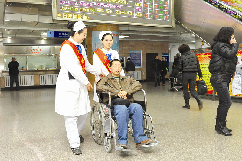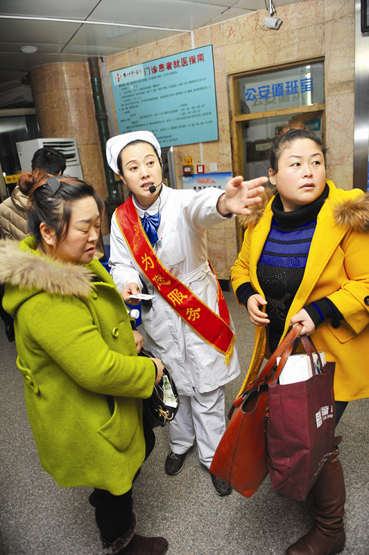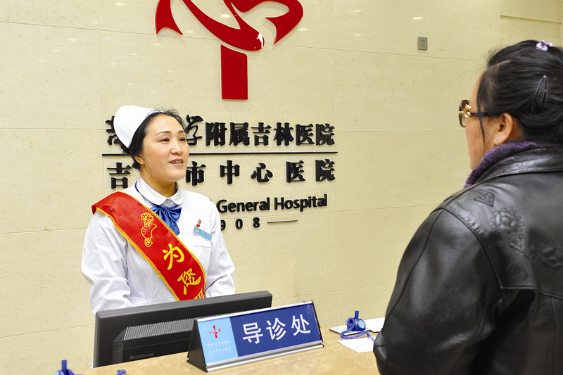 “您好,请问需要什么帮助?”“您哪里不舒服?”“请到三楼皮肤科就诊”……一声声亲切的问候让冰冷的医院大厅霎时温暖,一步步快速准确的指引抚慰了就医患者焦躁的心灵。她们身穿白色护士服,身披红色绶带的导诊员在人流涌动中格外显眼,她们就是吉林市中心医院康乃馨服务中心一楼服务单元可敬可爱的导诊护士们。