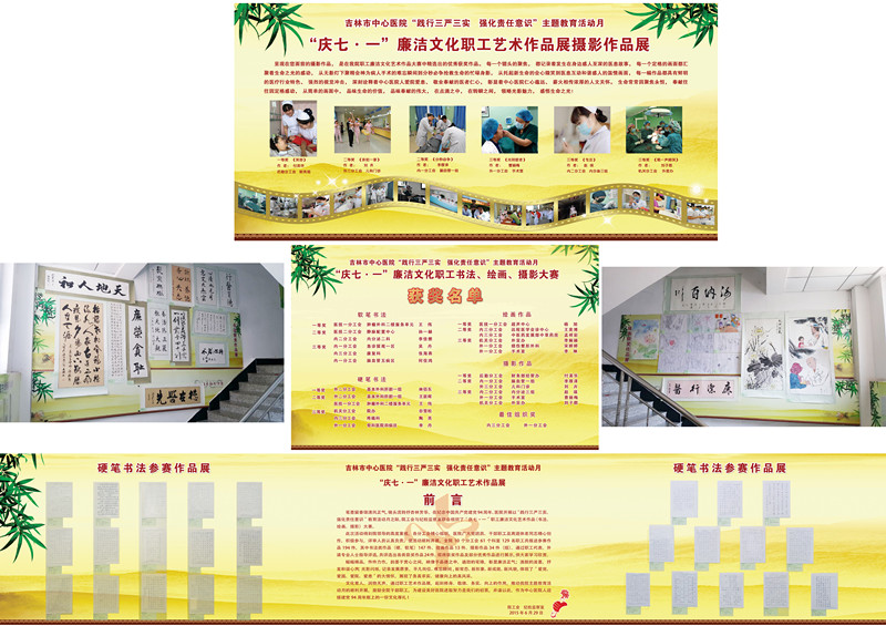为践行三严三实、强化责任意识、加强我院廉洁文化教育,院工会在“七.一”来临之际,开展了以医院廉洁文化建设为主题的职工书法、绘画、摄影比赛活动。此次活动共有我院10个支部的193名职工参与,征集反腐倡廉作品193幅,经过层层评选,最后共有24幅作品获奖,有56幅作品在院工会职工园地及廉洁文化长廊展出。通过本次比赛的宣传、发动和展出,使广大职工深受廉洁之风的感染和熏陶,增强了我院干部职工的廉洁从医观念。