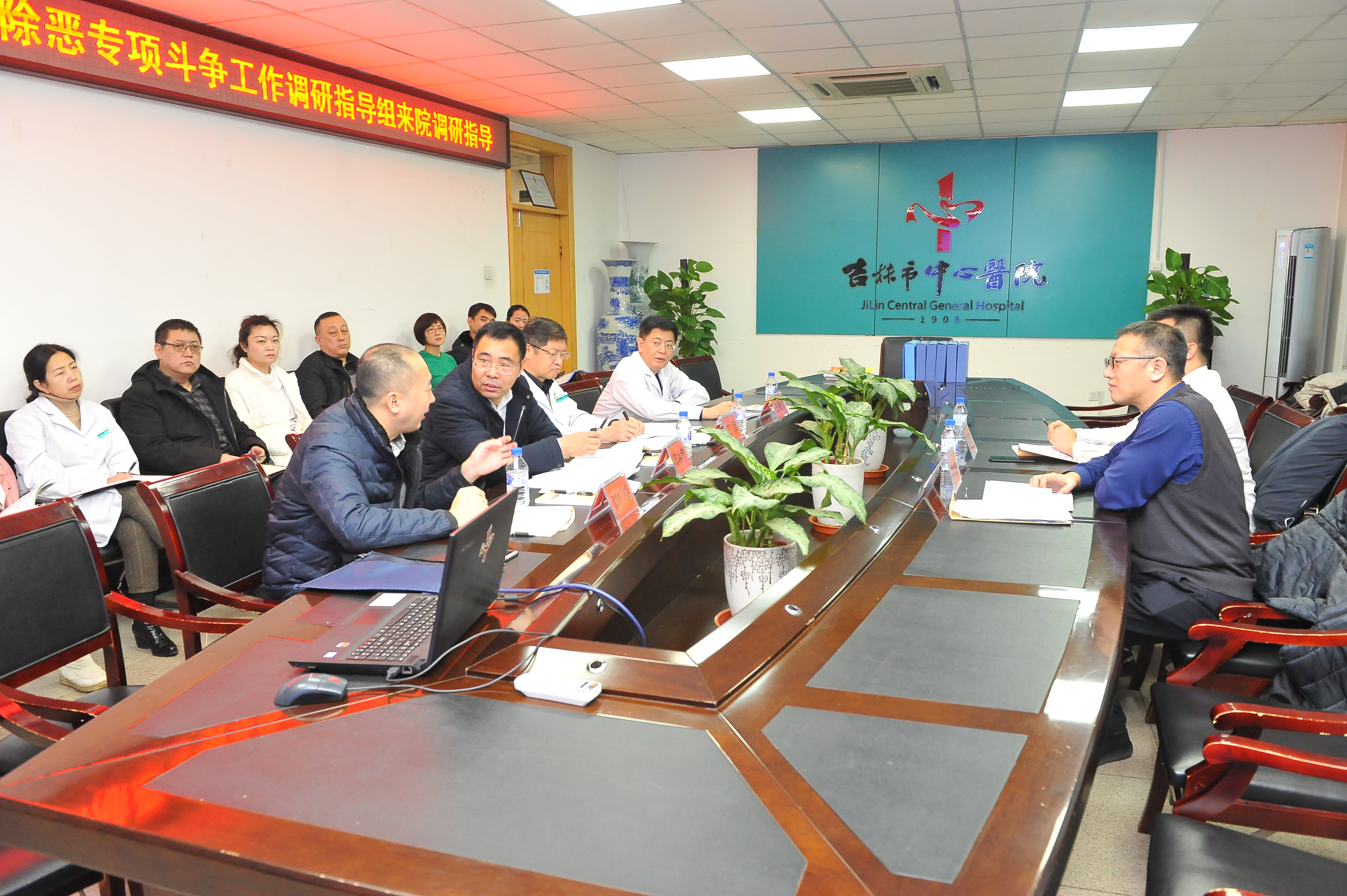 1月16日,省卫生健康委调研指导组张巍、张索宇一行两人莅临吉林市中心医院开展扫黑除恶专项斗争工作督导。市卫生计生委纪委书记邱林华、党办副主任谭广举,中心医院党委书记王昶、副院长王建东及相关职能部门负责人参加了会议。