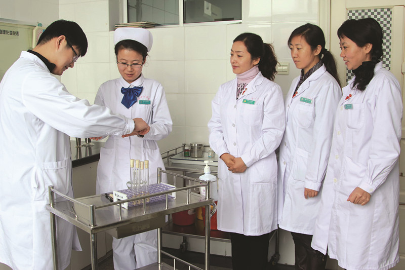 感染管理科主任任海燕(右三)现场检查手卫生监测情况