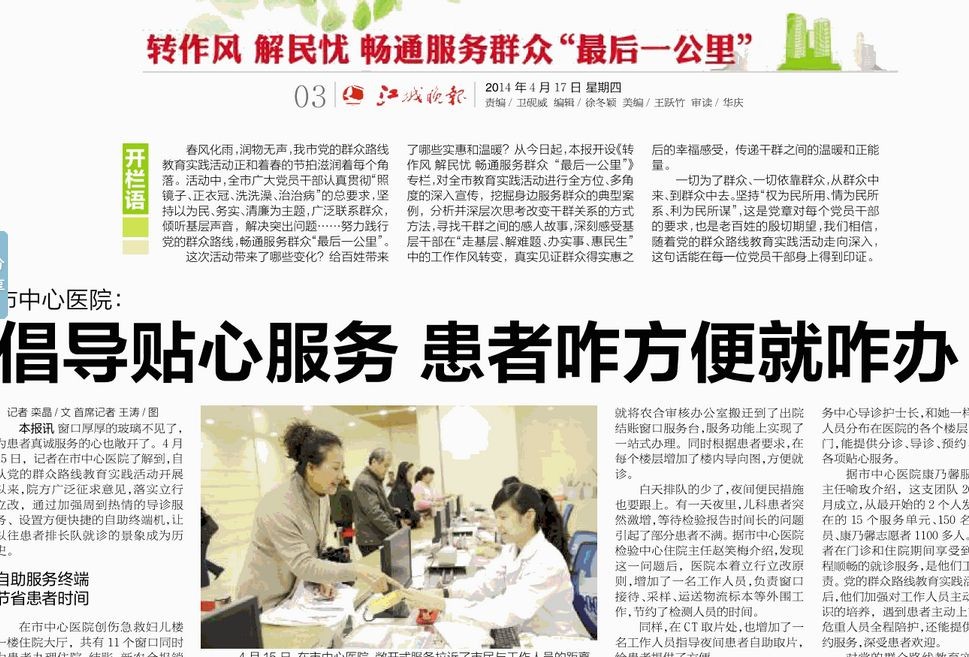 江城晚报 2014年4月17日 市中心医院: 倡导贴心服务 患者咋方便就咋办