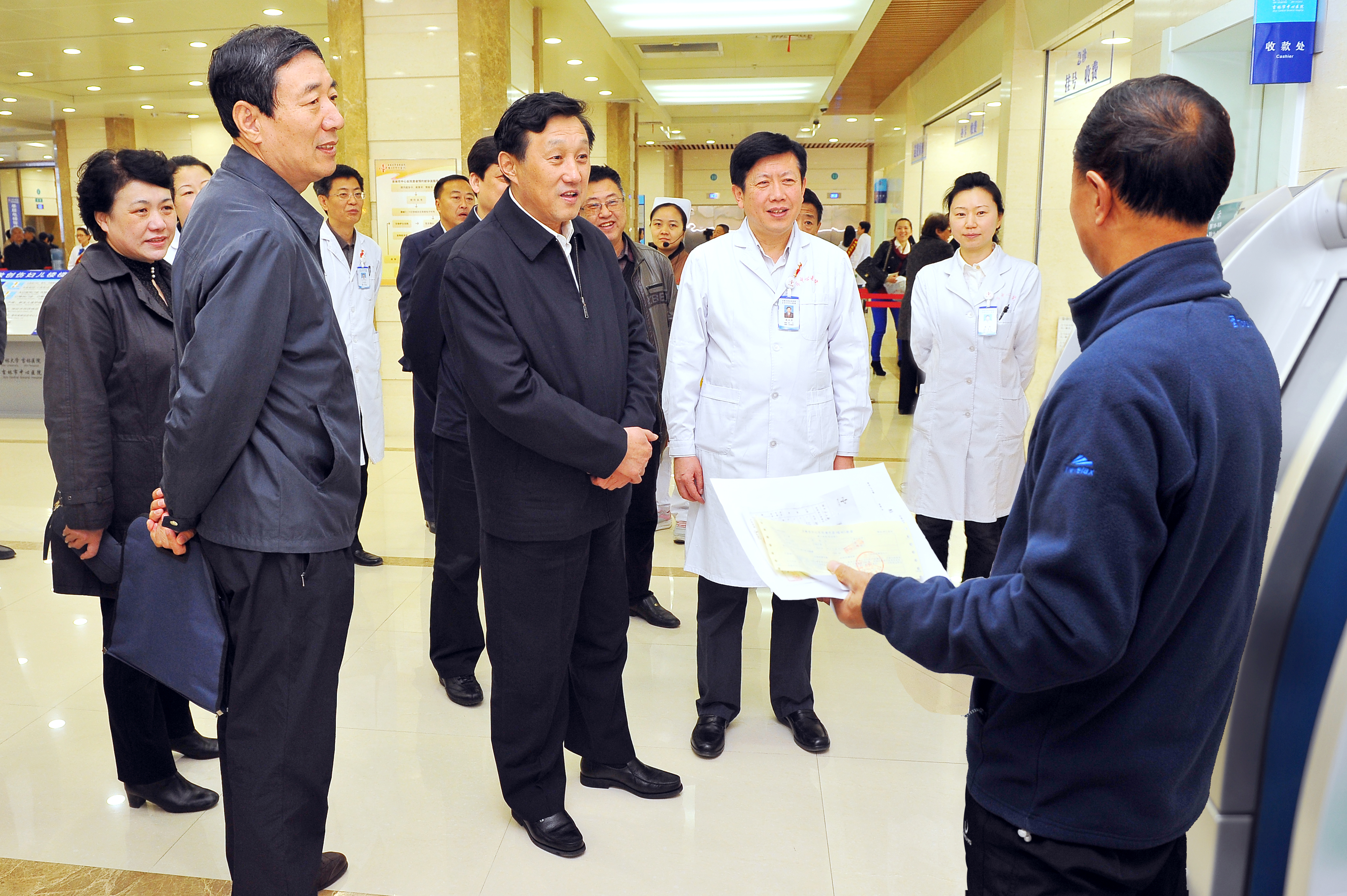 市委书记张晓霈(左三)、市卫生局局长聂景山(左二)、中心医院院长钱大为(右三)面对面与患者交流,认真聆听患者心声。