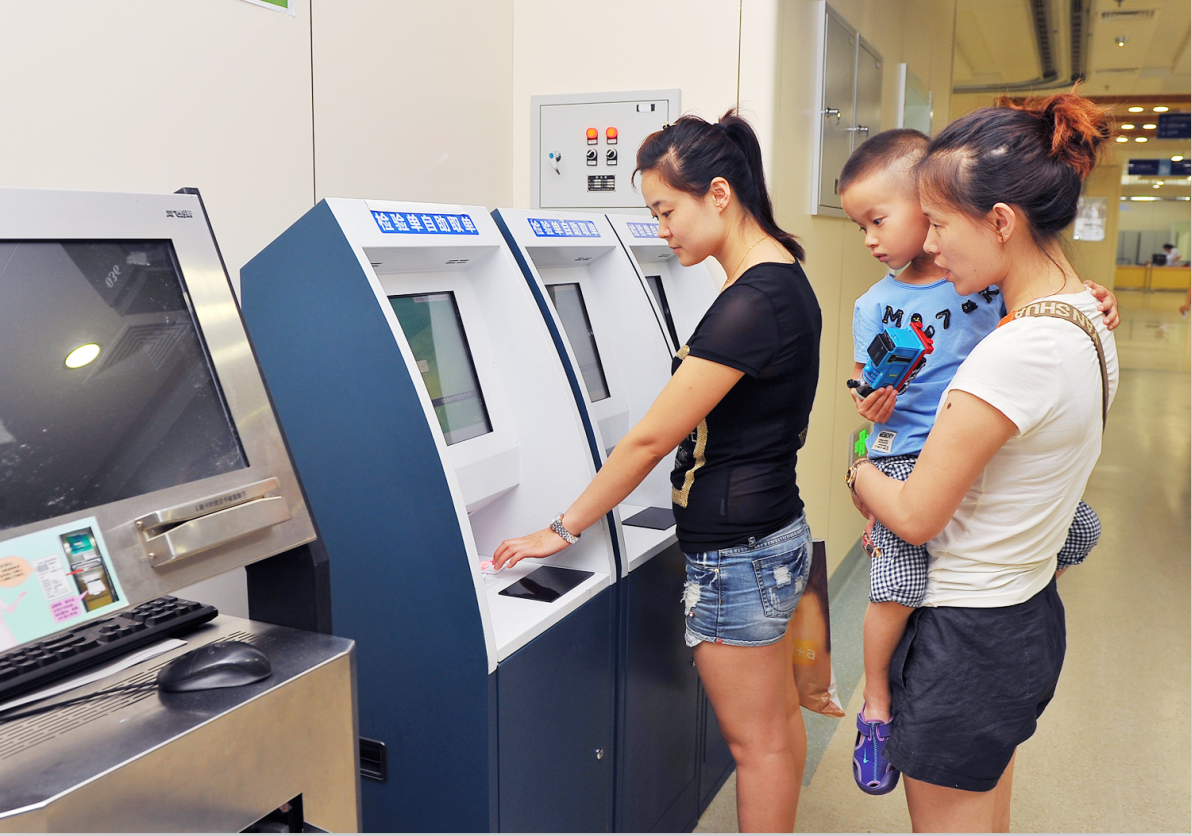 2012年,医院再次对数字化门诊进行优化升级,所有病人,包括自费、医保和银联卡持卡患者(内部就诊卡、医保卡、银行卡)均可在自助终端上预授权一定的就诊费用,在就诊过程中无需缴费,只需就诊完毕离院前一次结算。同时,自助终端机增加到62台,实现了全院广覆盖。这项举措完全颠覆了传统意义上的门诊流程,大大缩短了患者排队时间,提高了门诊服务质量,赢得了患者的称赞。
