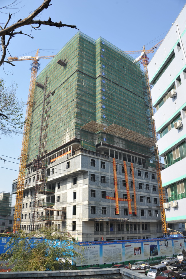 2012年10月12日上午11点18分,吉林市中心医院新建门诊病房综合楼顺利封顶。该楼建筑面积70500平方米,地下2层(停车场),地上19层,建筑高度76.88米。目前已投资2.45亿元。