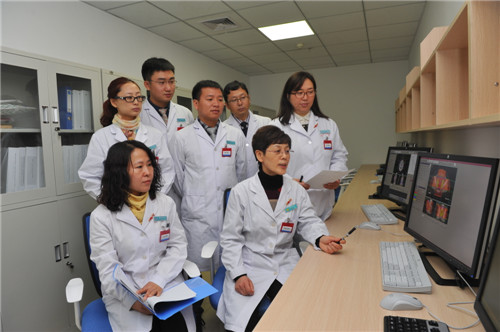市中心医院放射治疗中心主任潘福娟前排(右)组织医生开展治疗计划评估