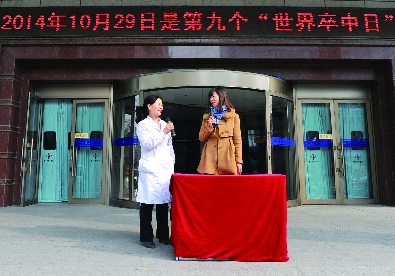 中心医院通过多种形式向群众普及脑卒中知识。图2为市中心医院联合市经济广播电台健康之声频率在肿瘤外科楼门前通过现场直播宣传脑卒中相关知识。