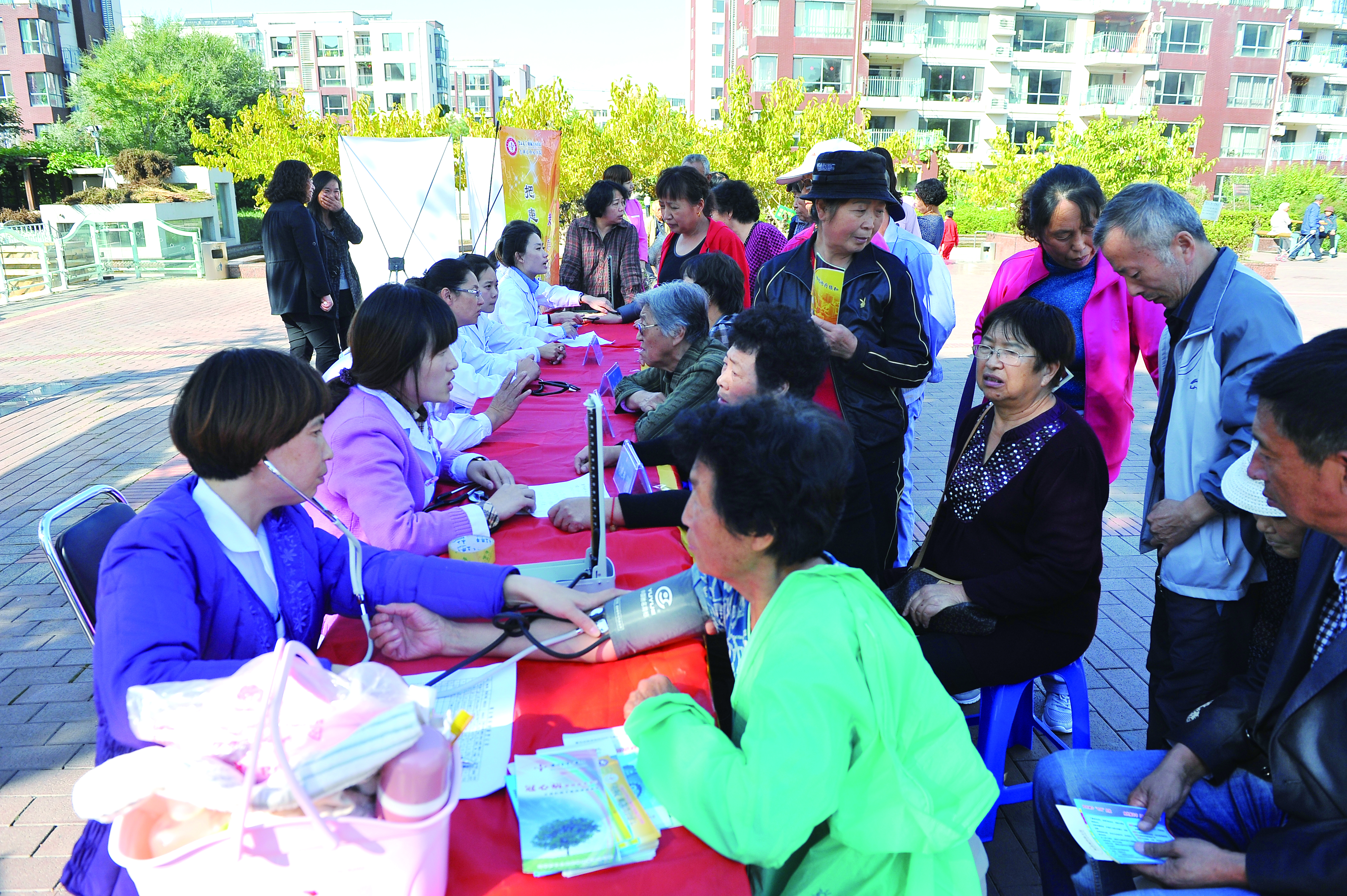 9月25日下午,市中心医院随访慢病办组织专家到鸿博锦绣社区为居民免费提供义诊服务。图5为医务人员为居民检查身体。