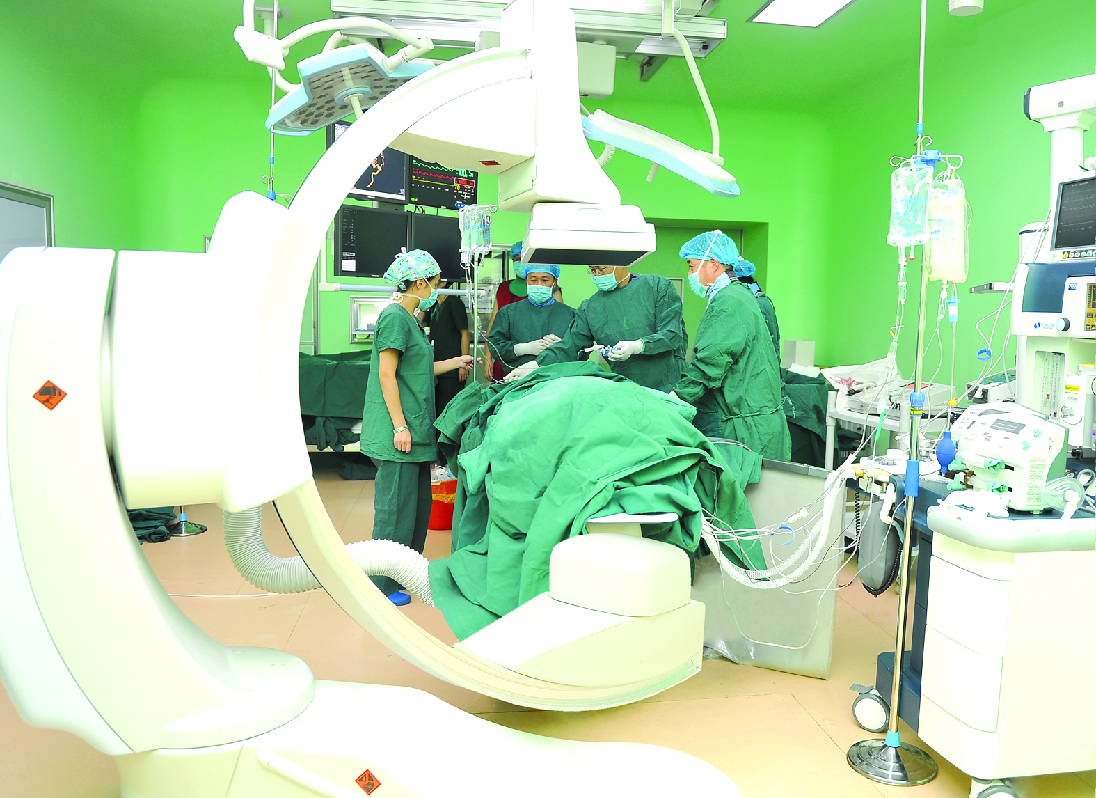 手术室内安装有数字平板血管造影系统,该设备具有数字减影、3D旋转造影等功能。在手术室内,除安装介入手术所需的血管机、高压注射器、视频医用显示器、放射线防护设备外,还配备了满足常规开放手术所需的设备吊塔、麻醉机、体外循环机等,使外科医生在手术室内不仅可以进行常规外科手术,还能够同时直接进行血管造影和介入治疗,在影像学信息的辅助下大大提高手术效率和成功率。