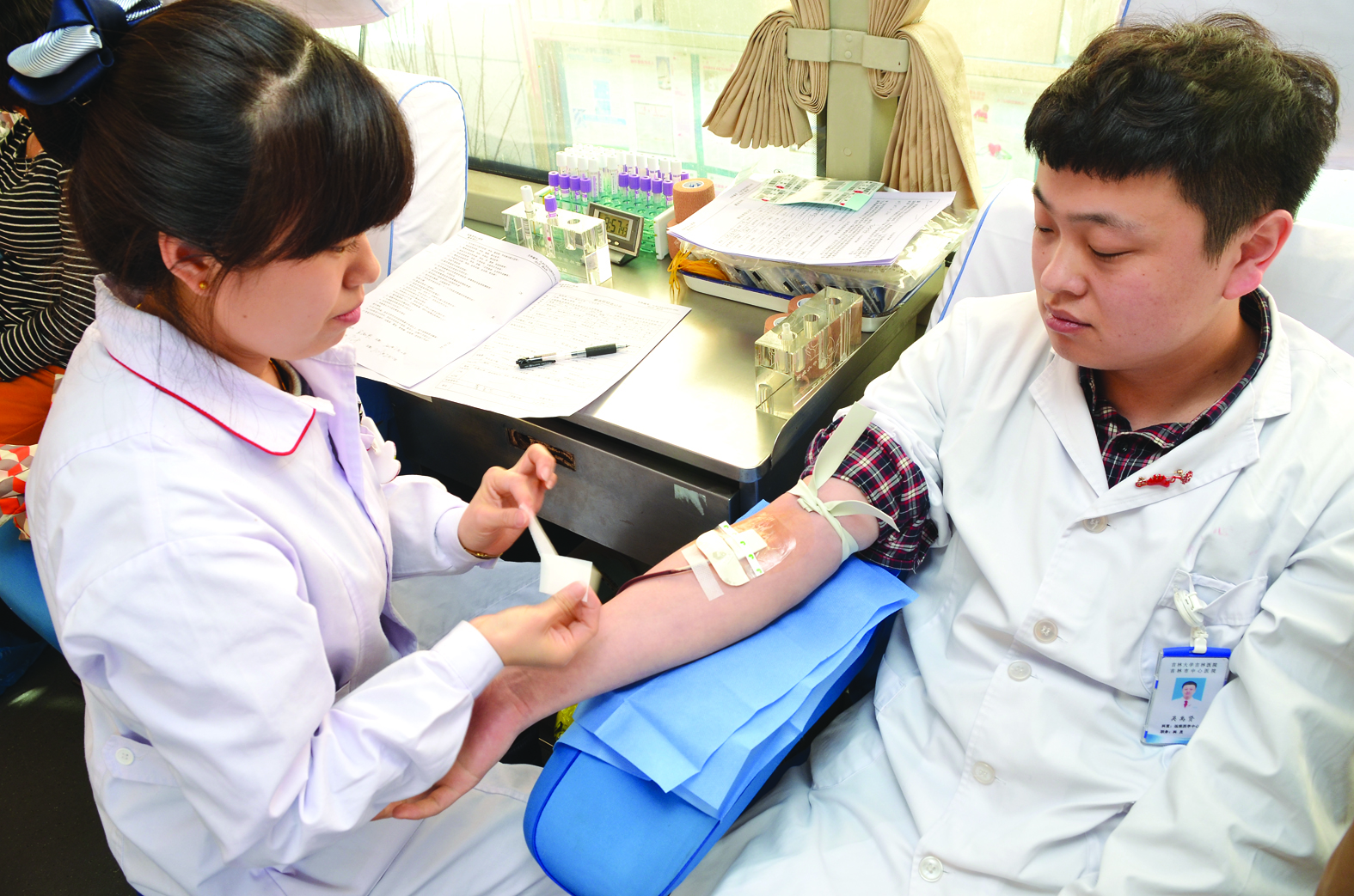 献血者来自医院临床、医技、护理、机关、后勤各个科室,他们有工作任务繁重的医生,有刚刚下夜班的护士,有今年新入党的预备党员,有长期处在重点岗位的职能科长,还有献血数次的科主任、普通职工……整个填表登记、测血压、排队化验过程始终都在一种轻松、愉快的氛围中有序进行。通过身体检查合格的52名同志个个兴奋不已,大家为自己能对社会做一点力所能及的事感到满足和自豪,同时也用愉悦的心情冲淡了采血过程中产生的紧张心理。