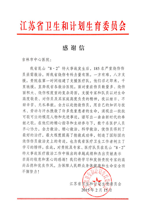 2014年8 月2日,江苏省昆山市发生特大火灾事故,185名严重烧伤患者亟待抢救。吉林市中心医院第一时间组派医疗队伍赶赴昆山,主任医师赵铁成夜以继日,全力以赴抢救伤员,同时医院还送去悬浮床等医疗设施。江苏省卫生计生委日前发来感谢信,高度赞扬市中心医院专家的高尚品德和优良作风。