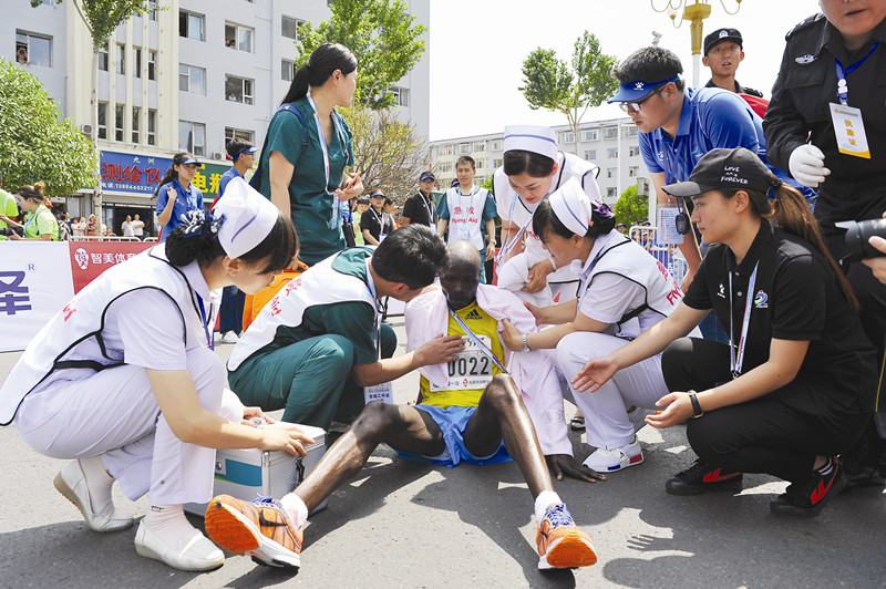 6月26日,2016吉林市国际马拉松赛在美丽的江城开跑。中心医院精选34名医护专家组成保障队出色地完成了赛事的医疗保障工作。图为:我院医护人员为参赛选手进行救治。