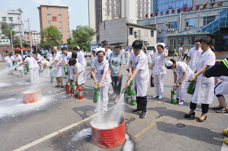 6月27日下午,中心医院消防科在医院内科楼东侧停车场组织了消防实战演习,全院各科室共148名消防安全员参加了消防演习。演习特别邀请吉林市消防支队王佳伟参谋来到现场指导工作并为全体人员讲解了水基型灭火器的使用方法。