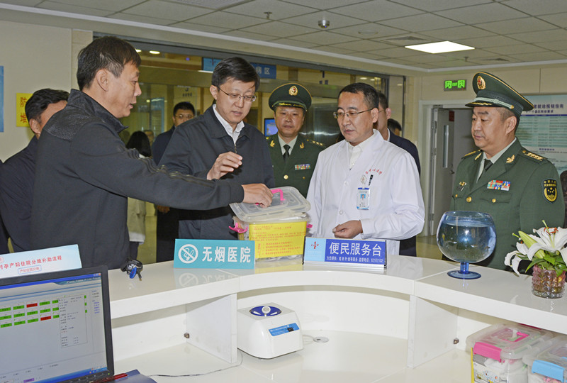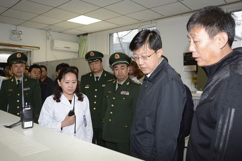 市长刘非(左二)在中心医院院长邵明宇(右二)陪同下正在检查病区消防备品