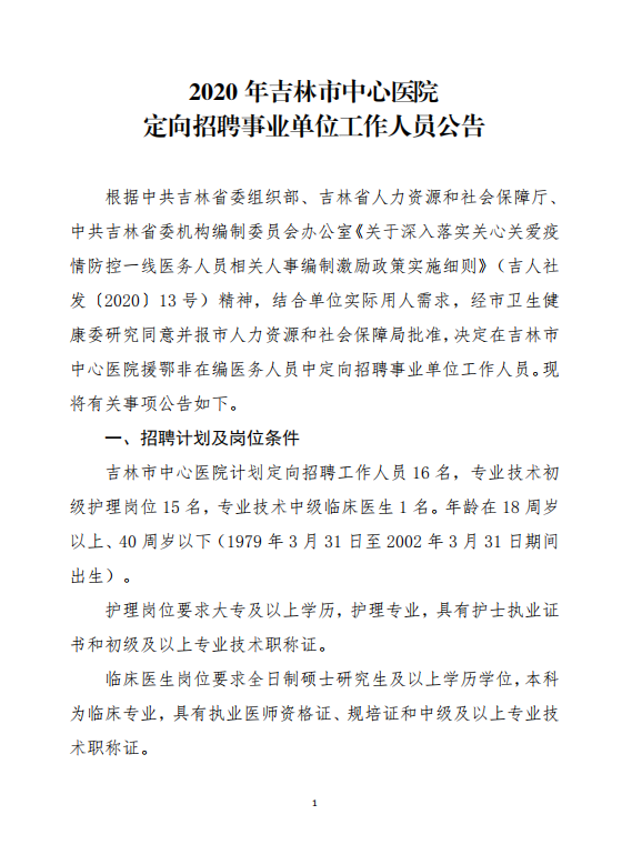 2020年吉林市中心医院定向招聘事业单位工作人员公告
