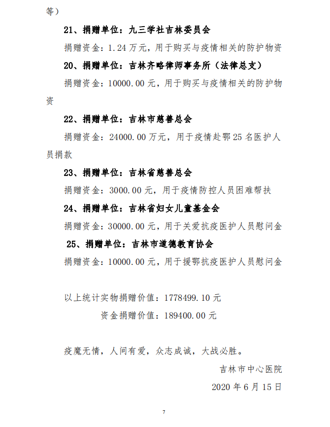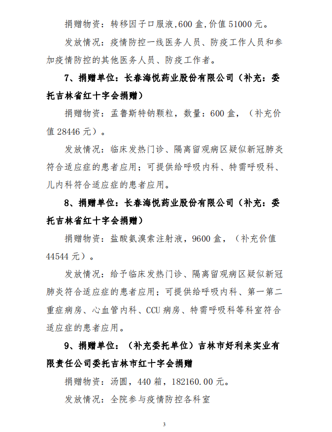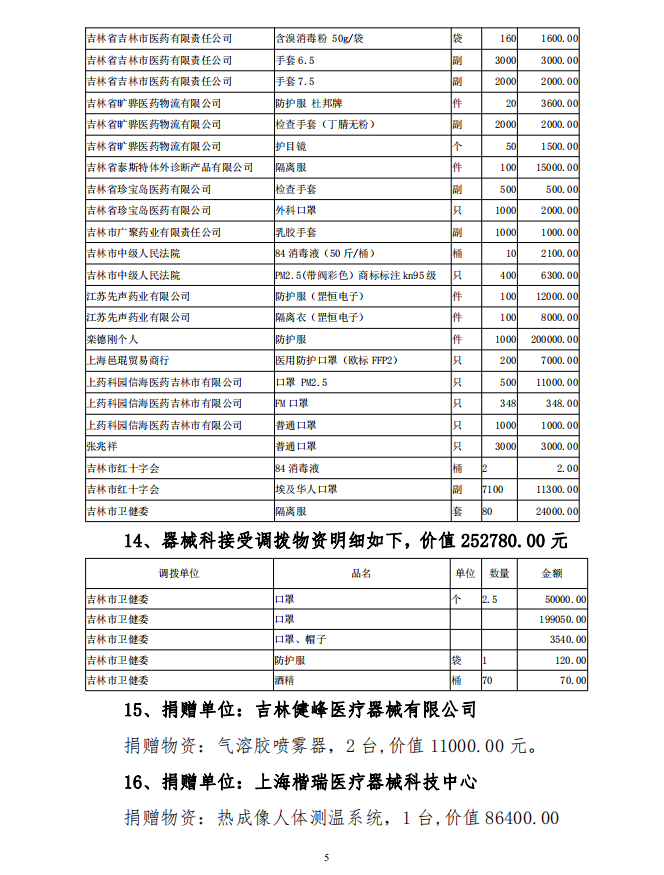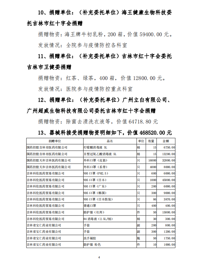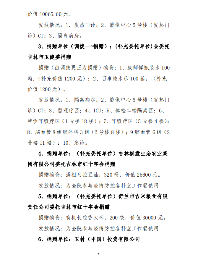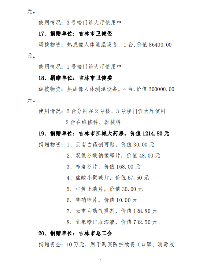 吉林市中心医院接受捐赠(调拨) 物资及使用情况公示