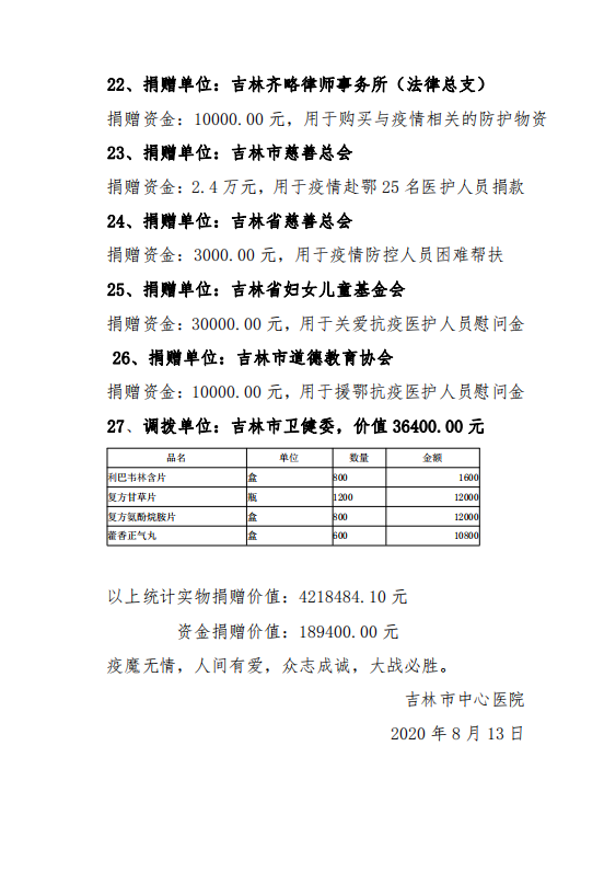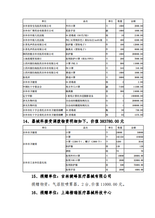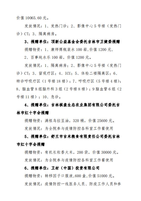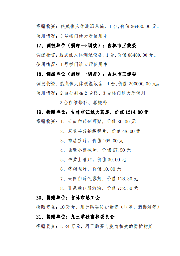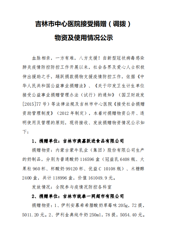 吉林市中心医院接受捐赠(调拨)物资及使用情况公示