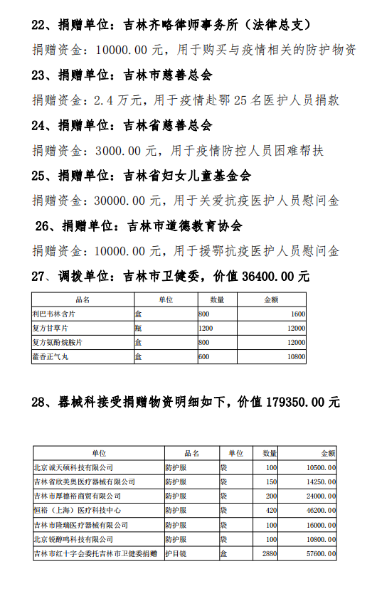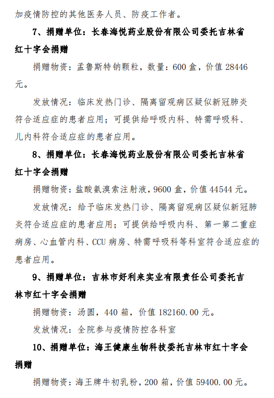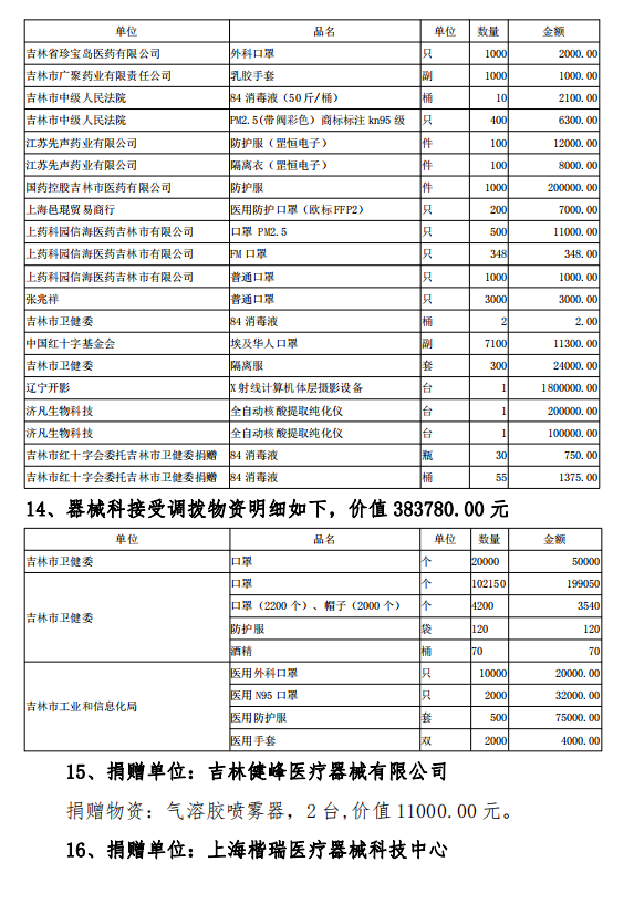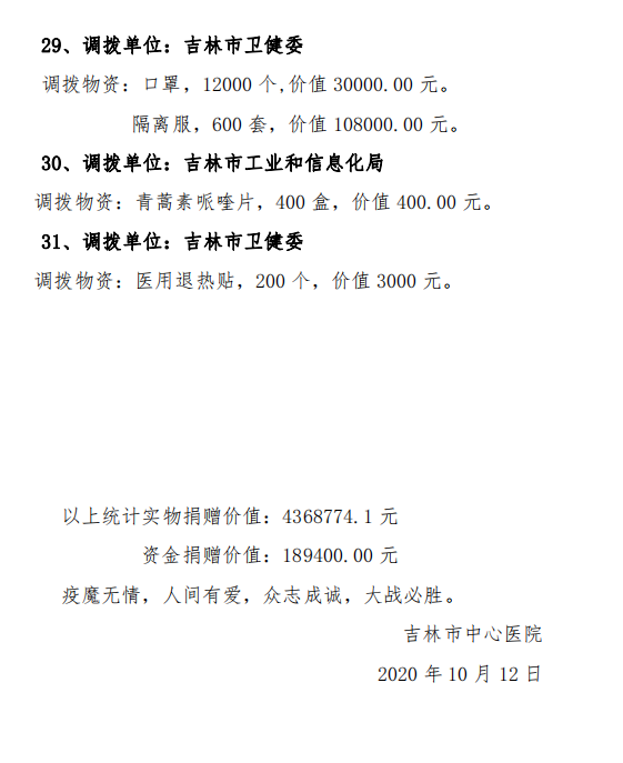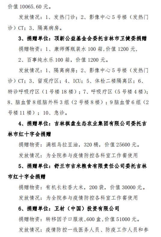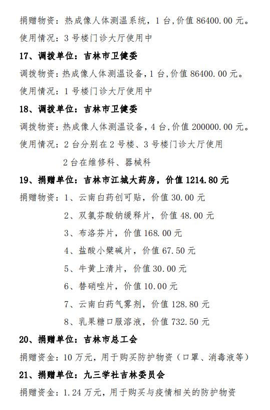 吉林市中心医院接受捐赠(调拨)物资及使用情况公示