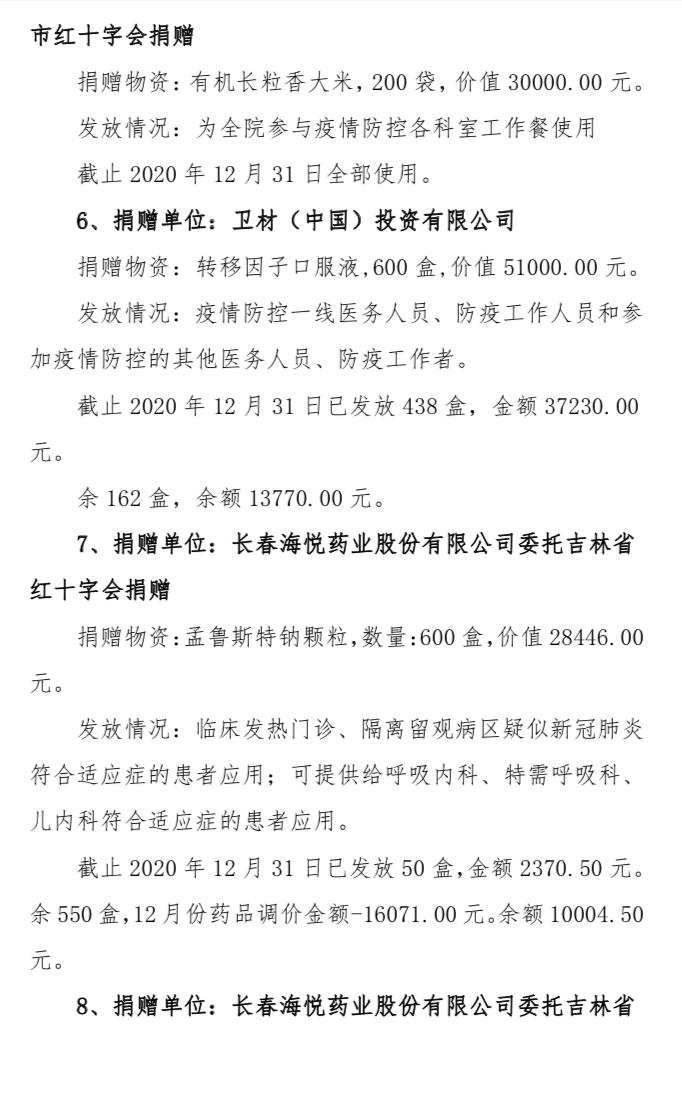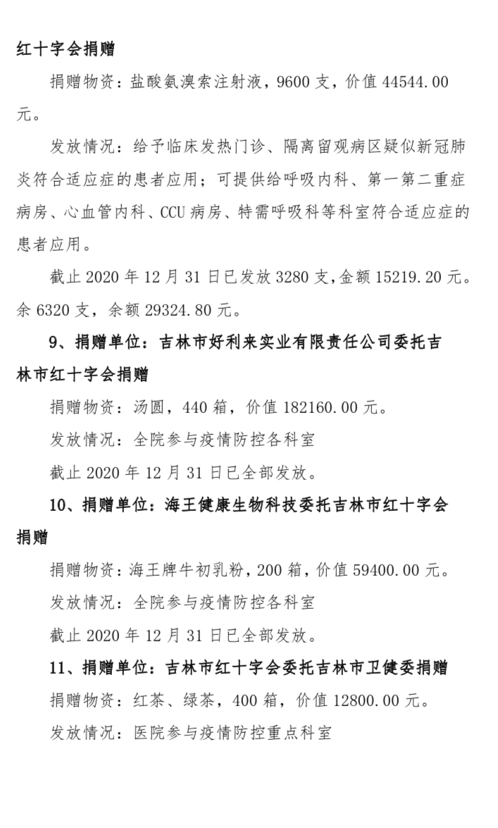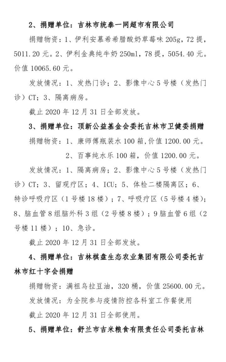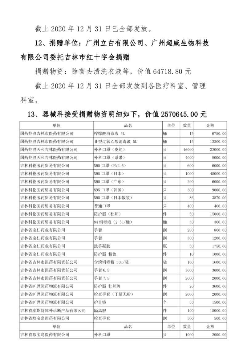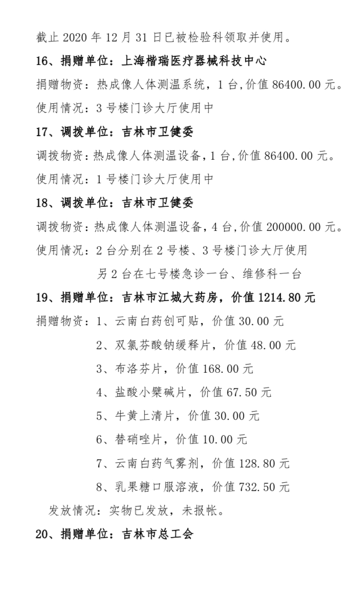 吉林市中心医院2020年度接受捐赠(调拨)物资及使用情况公示(1-12月)