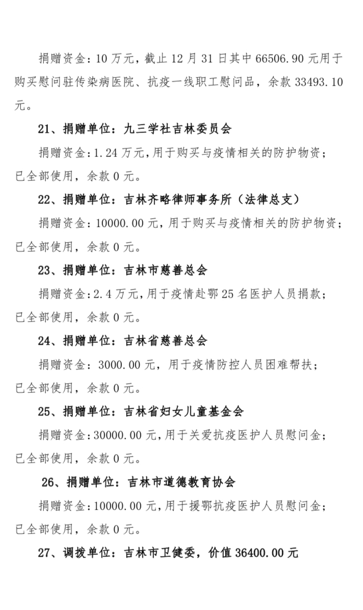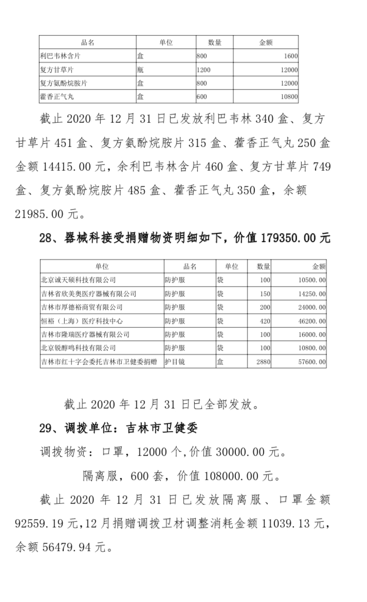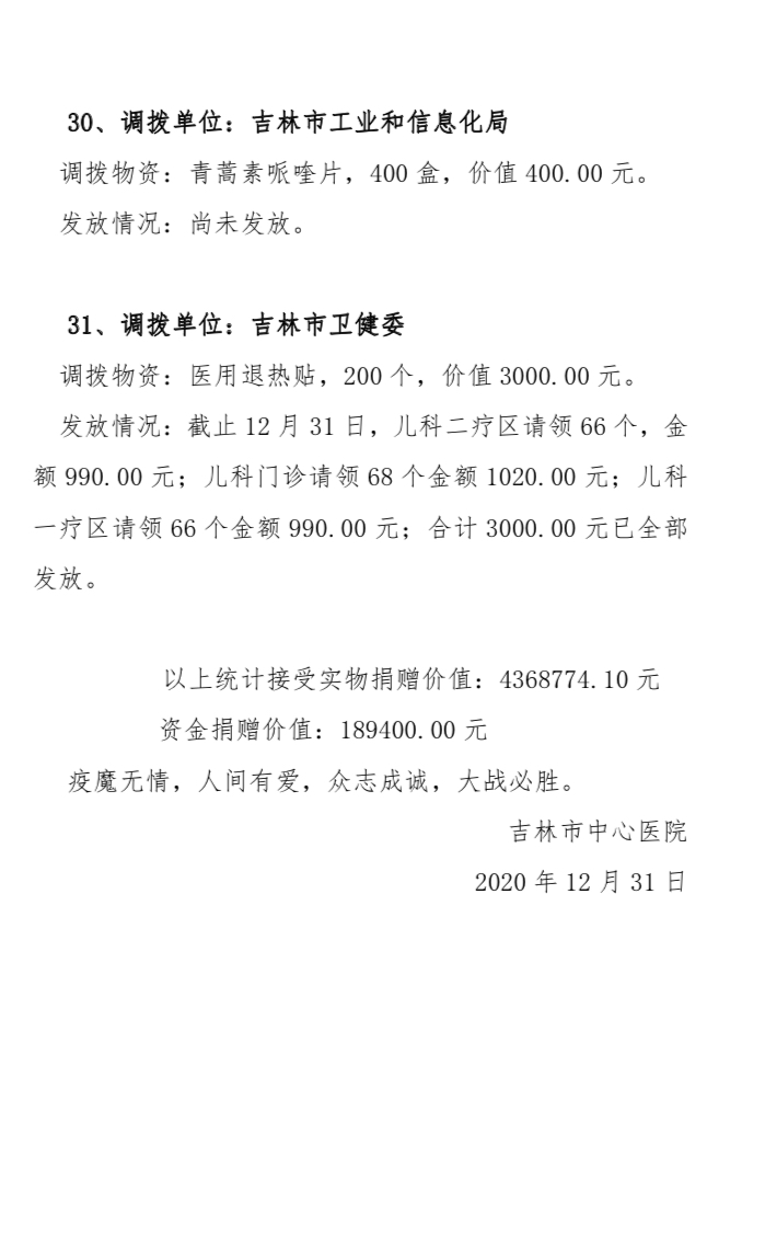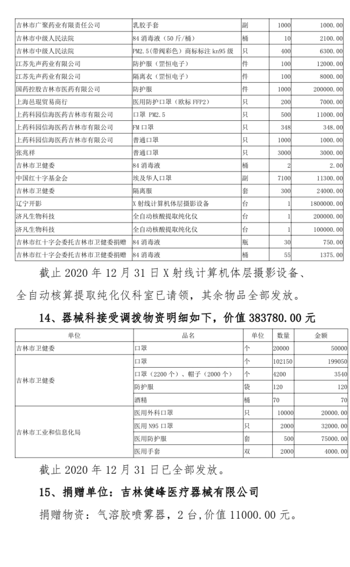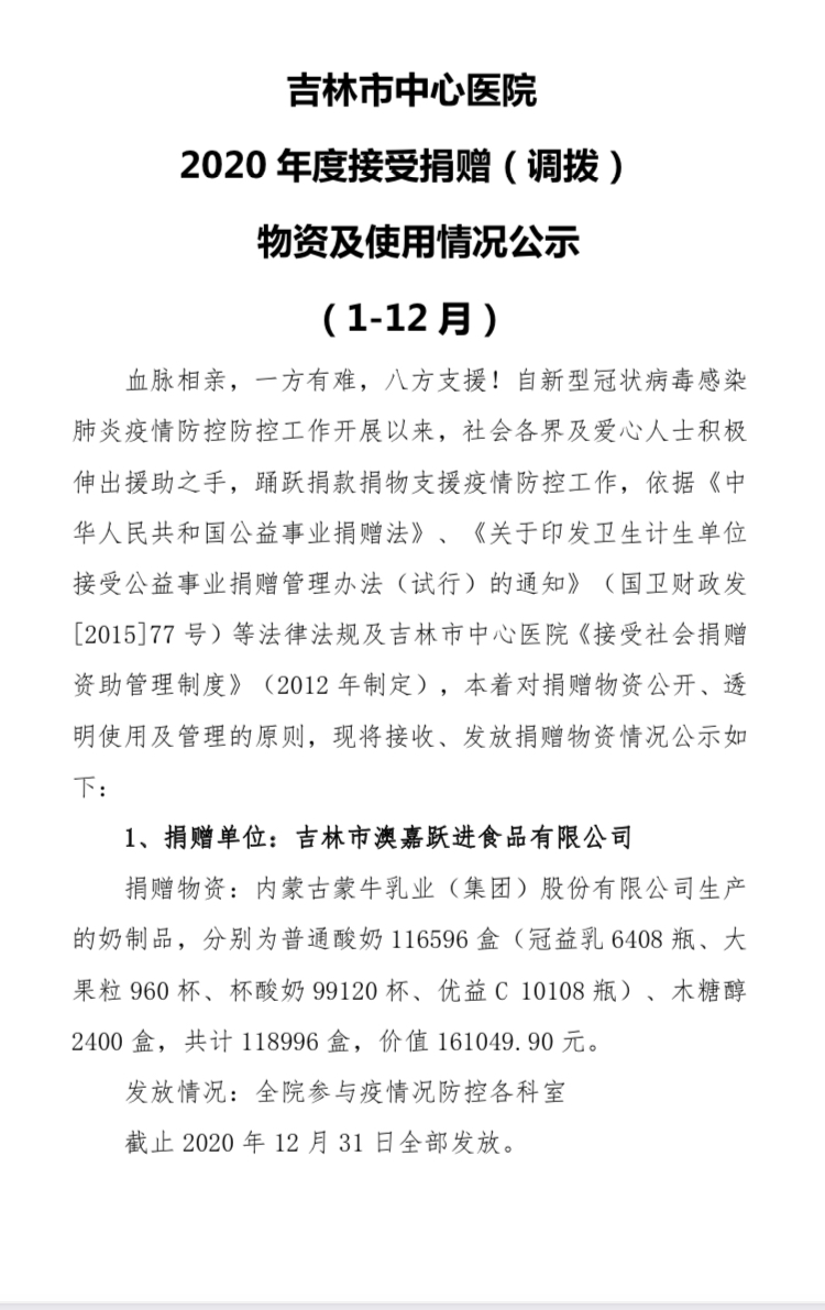 吉林市中心医院2020年度接受捐赠(调拨)物资及使用情况公示(1-12月)