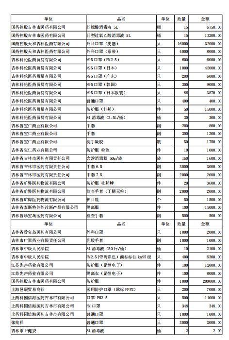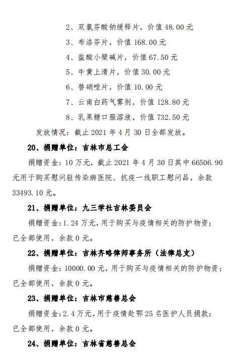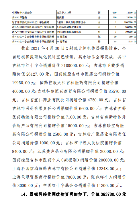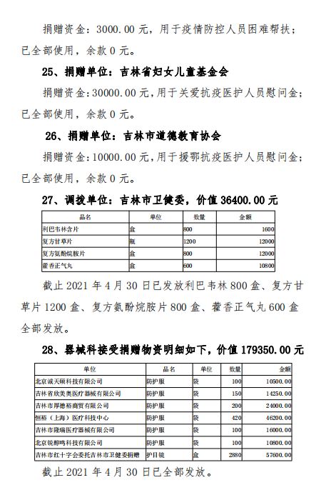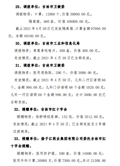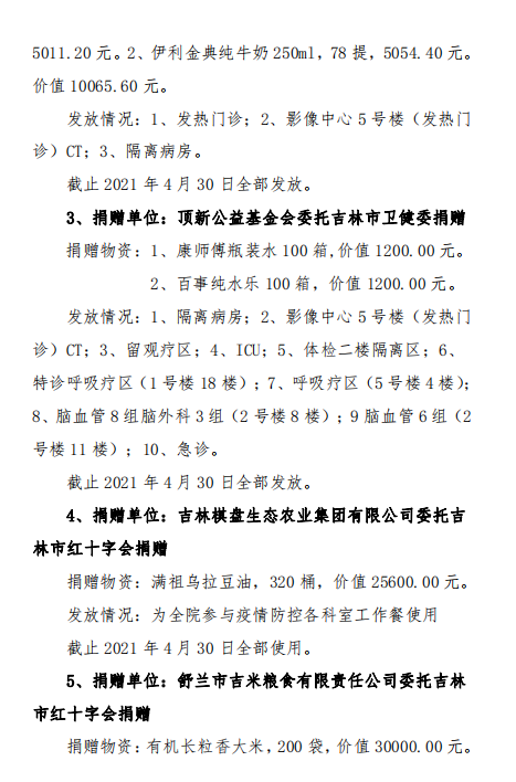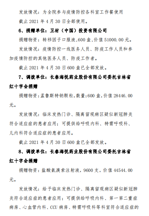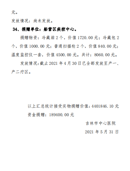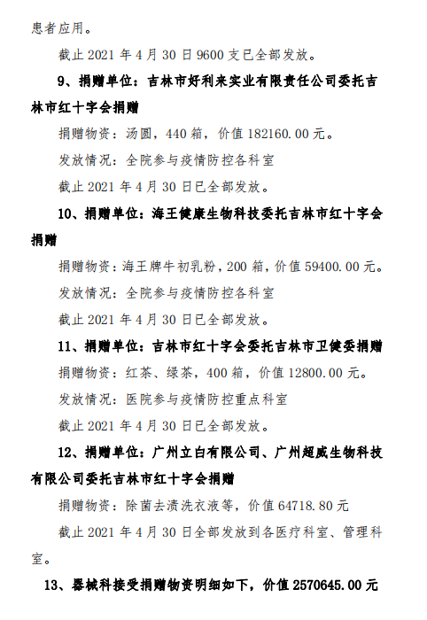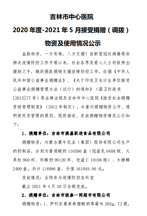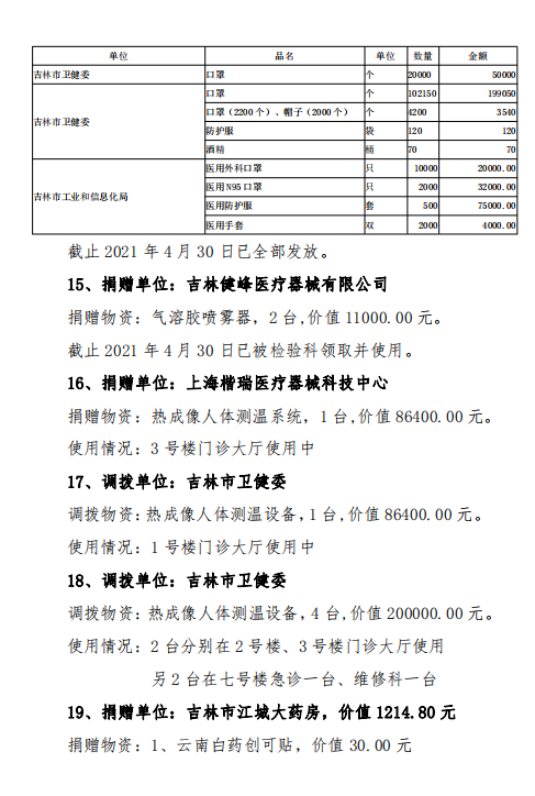 吉林市中心医院2020年度-2021年5月接受捐赠(调拨)物资及使用情况公示