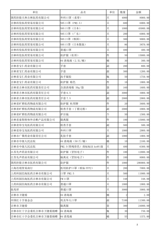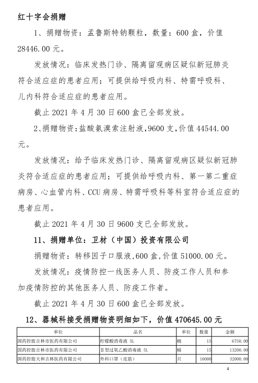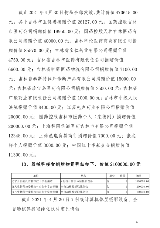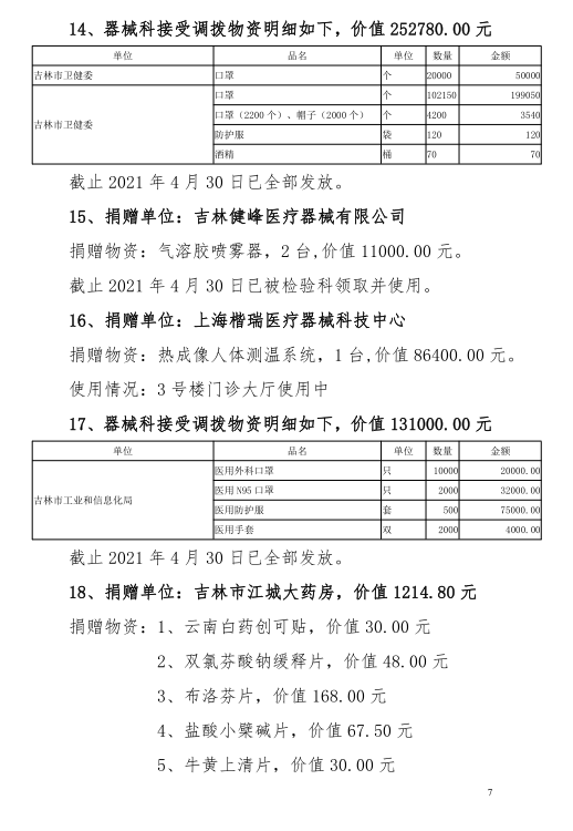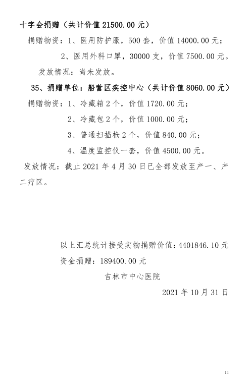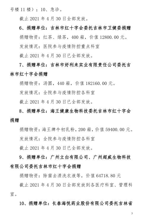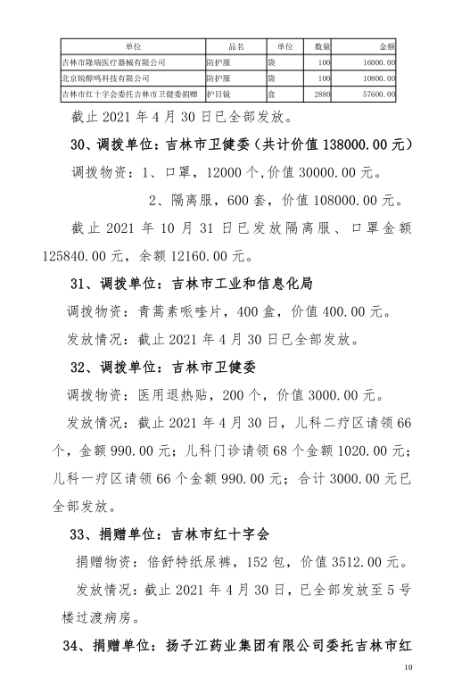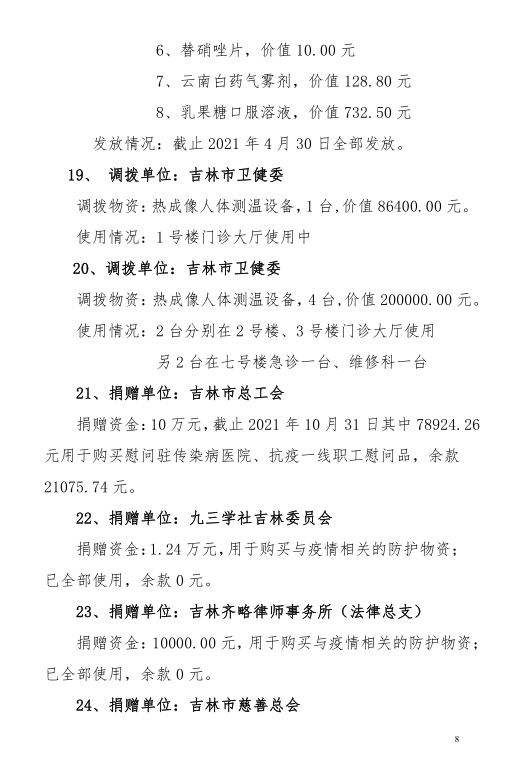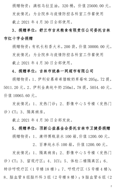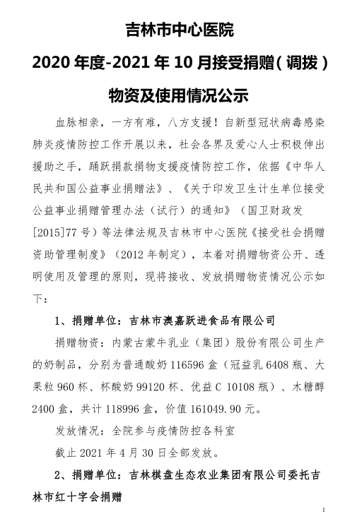 吉林市中心医院2020年度-2021年10月接受捐赠(调拨)物资及使用情况公示