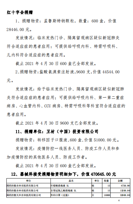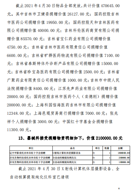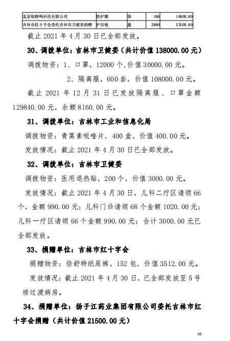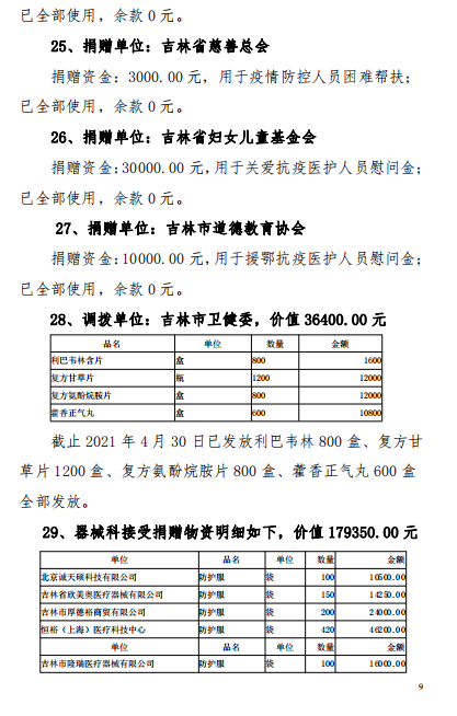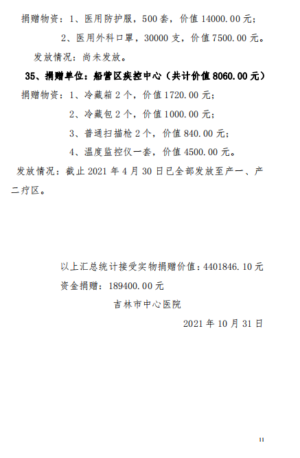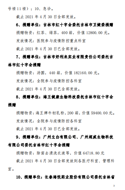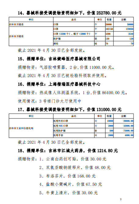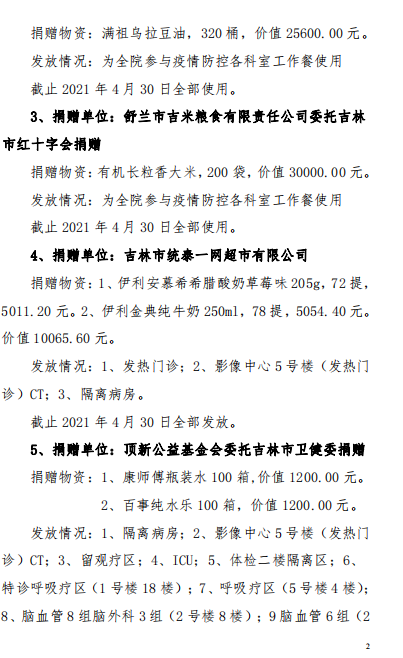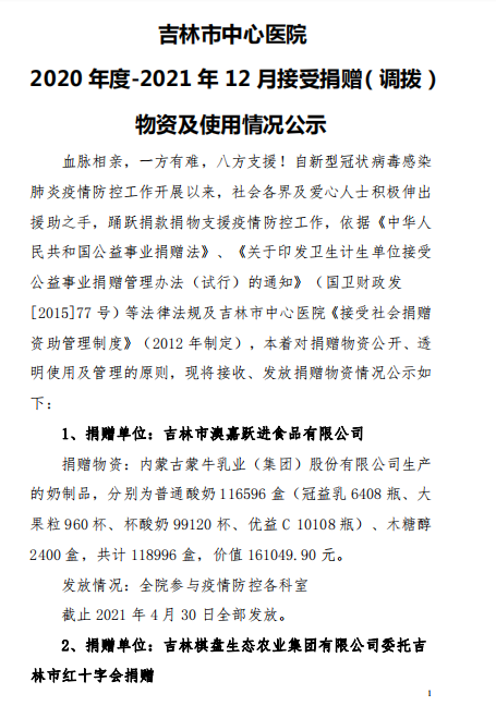 吉林市中心医院2020年度-2021年12月接受捐赠(调拨)物资及使用情况公示