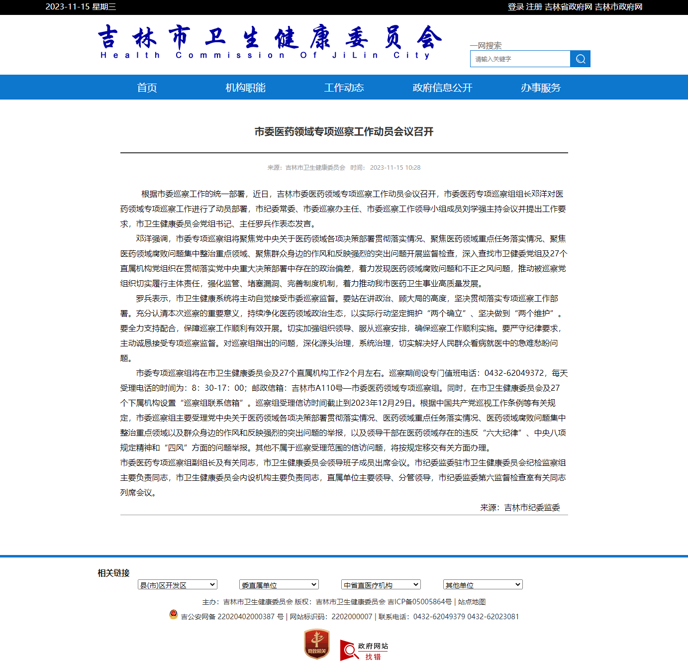 根据市委巡察工作的统一部署,近日,吉林市委医药领域专项巡察工作动员会议召开,市委医药专项巡察组组长邓洋对医药领域专项巡察工作进行了动员部署,市纪委常委、市委巡察办主任、市委巡察工作领导小组成员刘学强主持会议并提出工作要求,市卫生健康委员会党组书记、主任罗兵作表态发言。