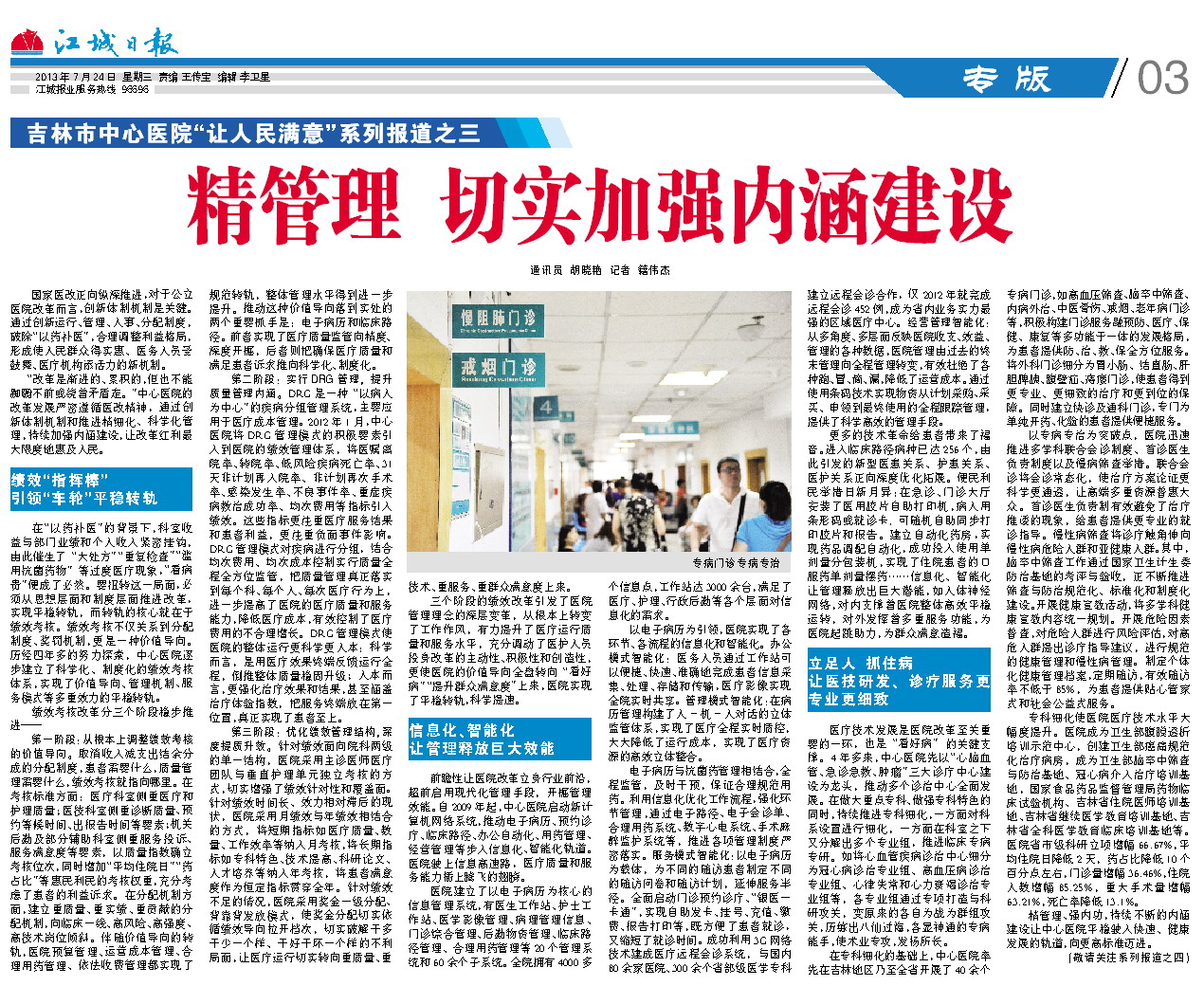 在专科细化的基础上,中心医院率先在吉林地区乃至全省开展了40余个专病门诊,如高血压筛查、脑卒中筛查、内病外治、中医骨伤、戒烟、老年病门诊等,积极构建门诊服务融预防、医疗、保健、康复等多功能于一体的发展格局,为患者提供防、治、救、保全方位服务。将外科门诊细分为胃小肠、结直肠、肝胆脾胰、腹壁疝、痔瘘门诊,使患者得到更专业、更细致的治疗和更到位的保障。同时建立快诊及通科门诊,专门为单纯开药、化验的患者提供便捷服务。