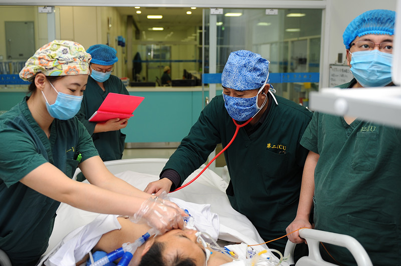 在这不平凡的12个半小时中,为打赢这场生命保卫战,张志博主任带头冲上救治的第一线,一整夜辗转于各个病房,实时监测每位重患的病情变化,并随时根据病情变化调整救治方案。与此同时,张主任还紧急调动了所有二线值班人员以及部分刚刚下班的医护人员。不论是刚下班到家不到3小时的医生于洋,还是凌晨1点正在熟睡的医生牛涧峰,还有刚下白班又立刻返回病区的护士吕薇,都在接到电话后赶到了病区,立即投入抢救。白班刚结束的副主任刘伟恒更是主动加班,即使第二天他还需要值24小时的班依然奋战在抢救的前线。