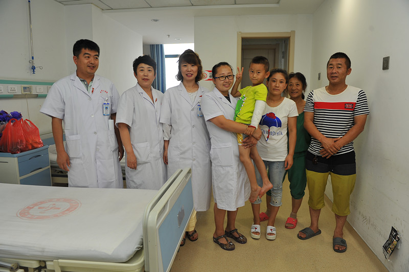 医护人员看望康复后的孩子(从左至右依次为:张彦东、孙桂荣、刘贺、岳冬晗)