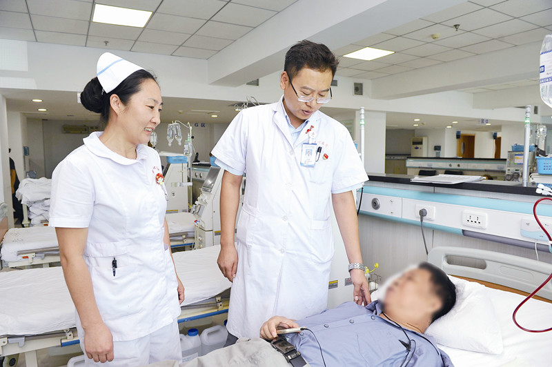 张大爷并不是唯一一位在肾内科享受如此待遇的患者。很多行动不便又没有家属陪伴的患者来院治疗时,这里的医护人员总是给予他们最多的关照;有些因家境贫困无法承担治疗费用的患者想要放弃治疗,朱学研主任就会一改平时温和的态度,严厉制止:“费用我给你垫上,别的不要多想,好好治病才是正经事儿!”同时期血液透析和腹膜透析的患者加在一起超过500人,但每一位朱主任都十分了解。这听起来似乎是不可能的,但朱主任和他团队的医护人员们做到了!因为,从患者踏入肾内科的那一刻起,在医护人员的眼里,患者就是他们的亲人,帮他们渡过难关,是医护人员唯一的愿望!