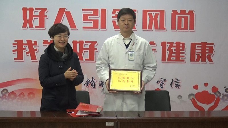 市文明办主任王媛向市中心医院党委书记王昶颁发“江城好人礼遇基地”牌匾