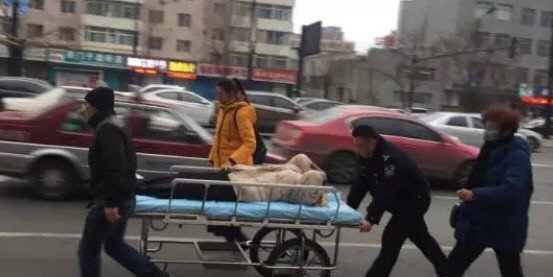 五分钟左右的时间,老人意识慢慢清醒,由于疼痛老人没办法站起来,只能一点点往路边挪动。在中心医院公安科的张军上班途中恰好看到这一场景,了解到老人是由于疝气发作,疼得没法动,安抚好老人及匆忙赶来的家属,立即与医院进行联系,然后飞跑到医院推来一辆担架车。最后,张军和家属一起把老人送到医院。