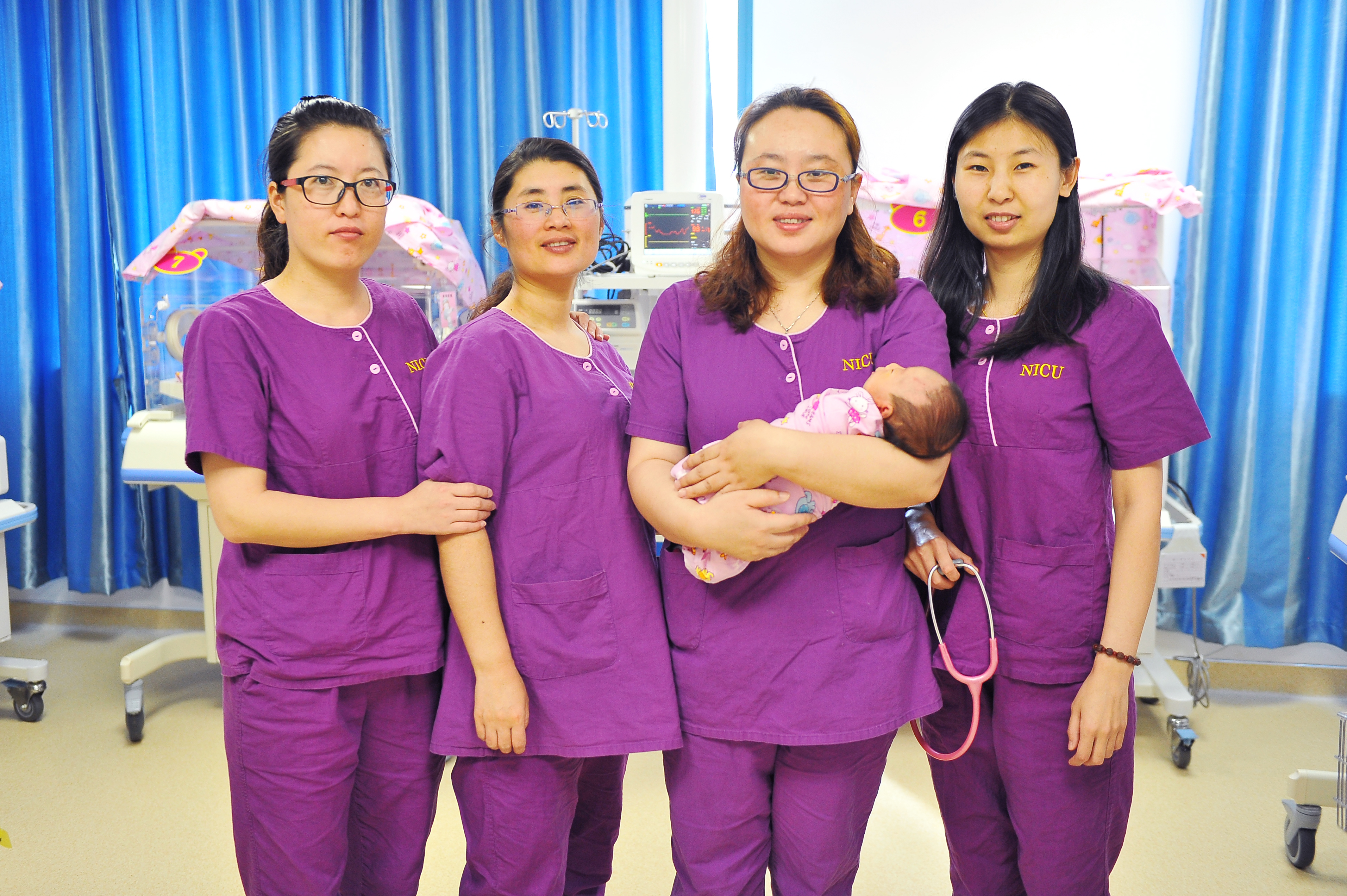 李春燕副主任(右二)和同事成功抢救严重贫血新生儿后合影