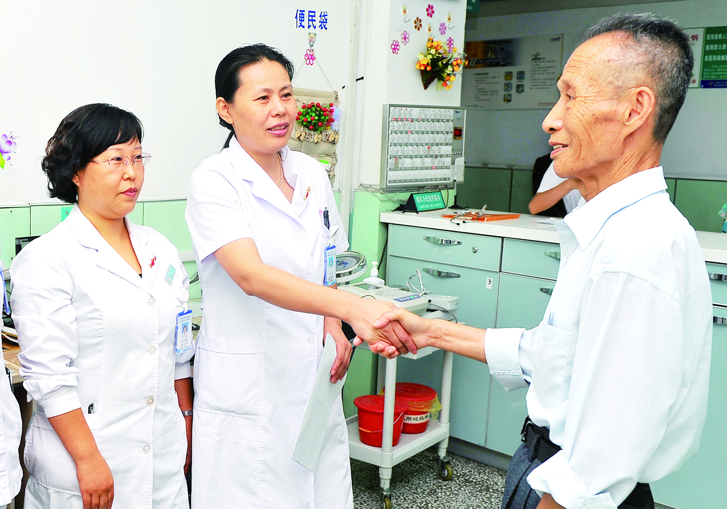 “这9天里我接触到的每位医护人员,都给我留下了很多感动,有的只是一件很细微的小事,却体现了中心医院的大爱。”王大爷每天早上5点多必须吃点东西,住院期间也是如此。那天早上,王大爷坐在医院走廊的椅子上喝豆奶,护士郝亮见到大爷便问:“大爷,您怎么不在屋里吃啊?”大爷只是简单说了句“屋里不太方便”,细心的她也没多说,只是进到病房仔细地观察起来。原来,王大爷隔壁床的病友排泄物还没倒,就放在王大爷的床头,气味十分难闻。郝亮连忙将污物倒掉,回来便对大爷说:“大爷,等邻床家属醒来我和他们沟通一下,以后有污物一定及时倒掉。”就是这一细小的举动,在早晚已稍感凉意的8月心里暖暖的。“我的血管不太好找,在其他医院经常被‘扎一送一’,可是这里的护士们不仅工作态度好,技术更好。每次都是‘一针见血’,一点也不疼。”在吕小丹护士长的带领下护士们个个热情开朗,技艺精湛。