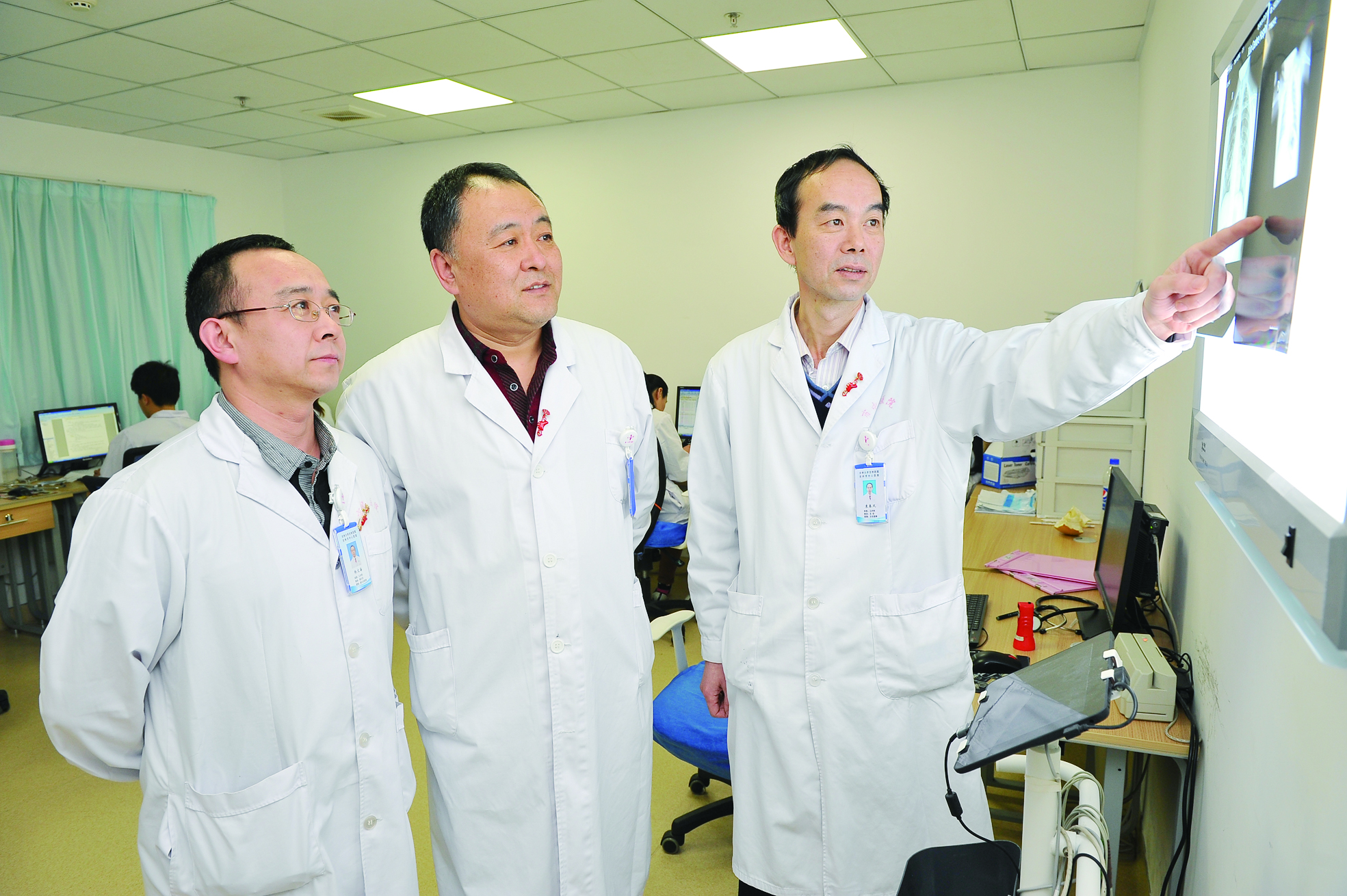 儿科疾病诊治中心儿外科专家袁春风(右)、徐鑫(中)、杨文海正在研究疑难病例