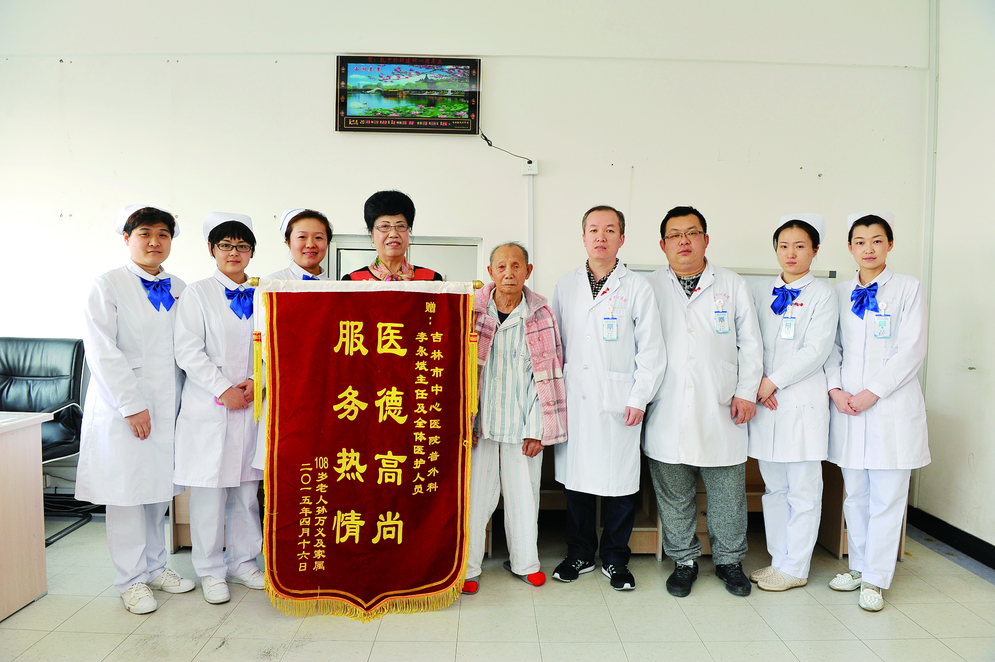 患者康复后,家属送来锦旗感谢李永斌主任(右四)